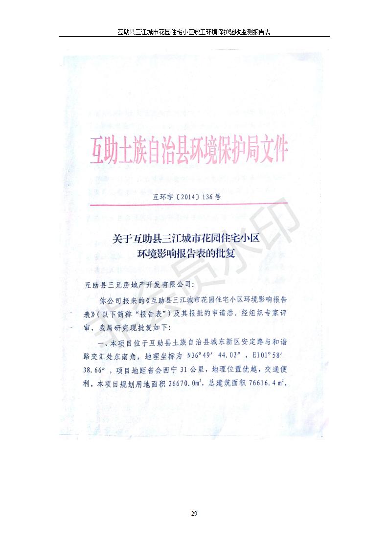 根據(jù)中華人民共和國國務(wù)院令第682號(hào)《國務(wù)院關(guān)于修改〈建設(shè)項(xiàng)目環(huán)境保護(hù)管理?xiàng)l例〉的決定》和《建設(shè)項(xiàng)目竣工環(huán)境保護(hù)驗(yàn)收暫行辦法》(國務(wù)院令682號(hào)),互助縣三江城市花園住宅小區(qū)(包括竣工環(huán)境保護(hù)驗(yàn)收監(jiān)測(cè)報(bào)告表和驗(yàn)收意見)公示如下。 一、項(xiàng)目名稱: 互助縣三江城市花園住宅小區(qū)竣工環(huán)境保護(hù)驗(yàn)收監(jiān)測(cè)報(bào)告表 二、地點(diǎn):青海省海東市互助土族自治縣威遠(yuǎn)鎮(zhèn)安定路與和諧路交匯處東南角 三、建設(shè)單位:青海三兄房地產(chǎn)開發(fā)有限公司 四、建設(shè)內(nèi)容:項(xiàng)目規(guī)劃用地面積26670.0m2,實(shí)際占地面積26670.0m2,項(xiàng)目占地面積未發(fā)生變化,規(guī)劃設(shè)計(jì)建筑總面積76616.4m2,其中商業(yè)建筑面積8994m2。實(shí)際建筑總面積58639.64m2,其中商業(yè)建筑面積9894.27m2。 五、聯(lián)系人:張工 六、聯(lián)系電 話:0971-6515411 七、公示時(shí)間:二〇一九年六月五日至二〇一九年七月三日 公示期間,對(duì)上述公示內(nèi)容如有異議,請(qǐng)以書面形式反饋,個(gè)人須署真實(shí)姓名,單位須加蓋公章。
