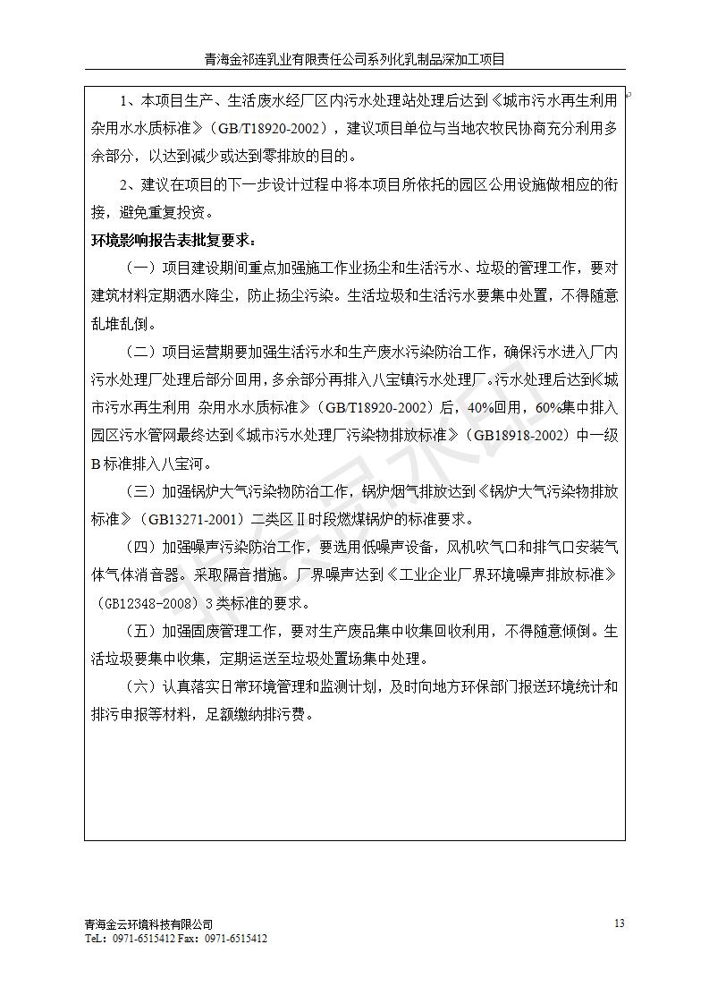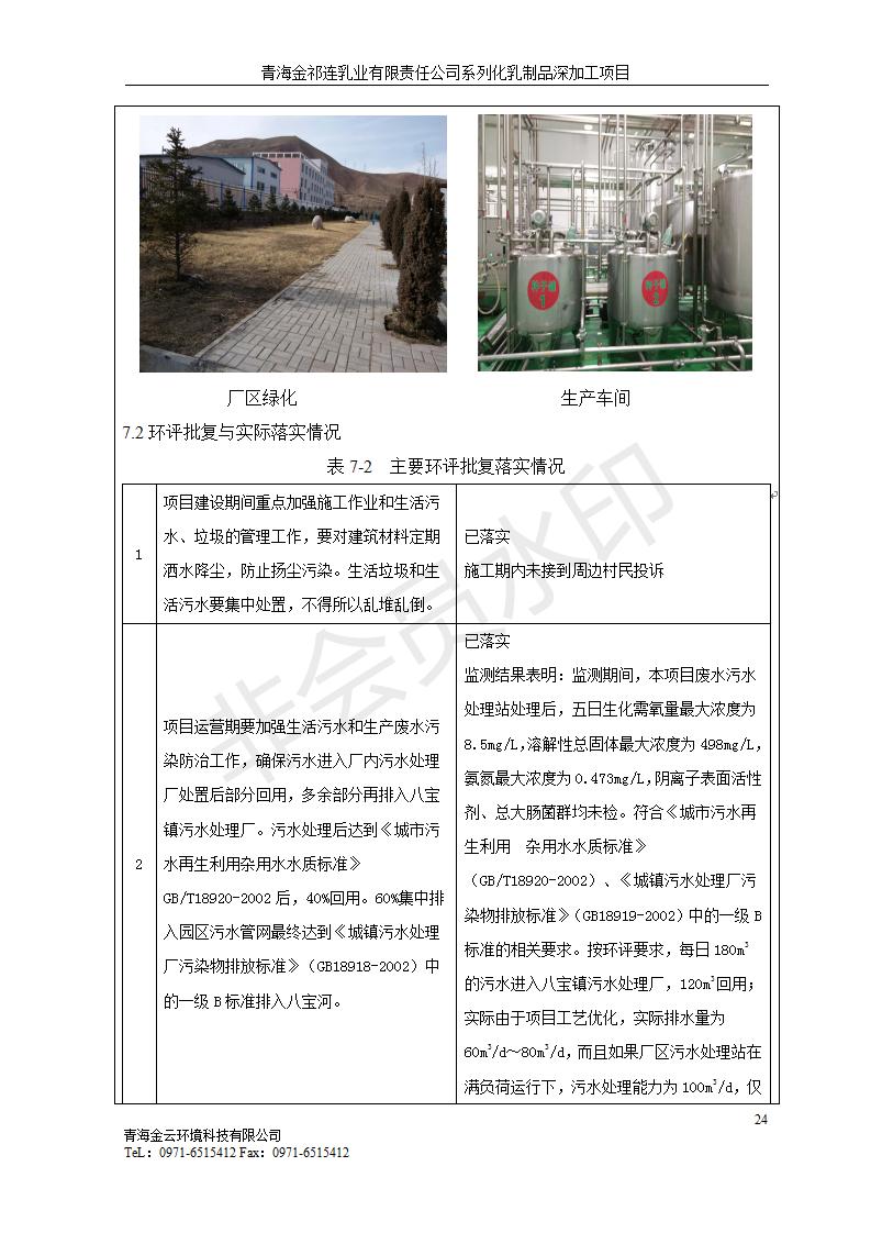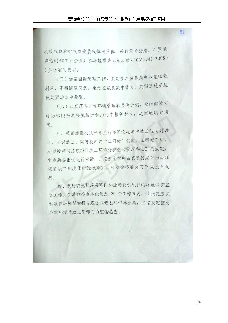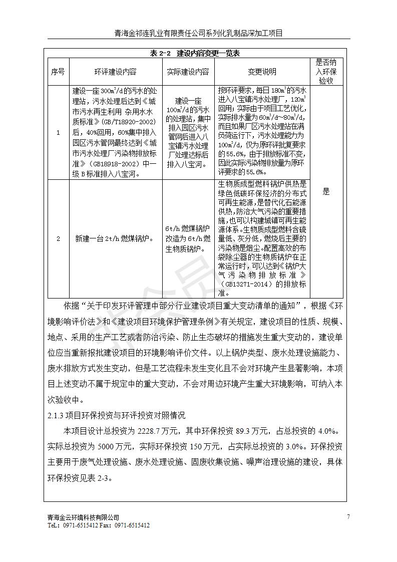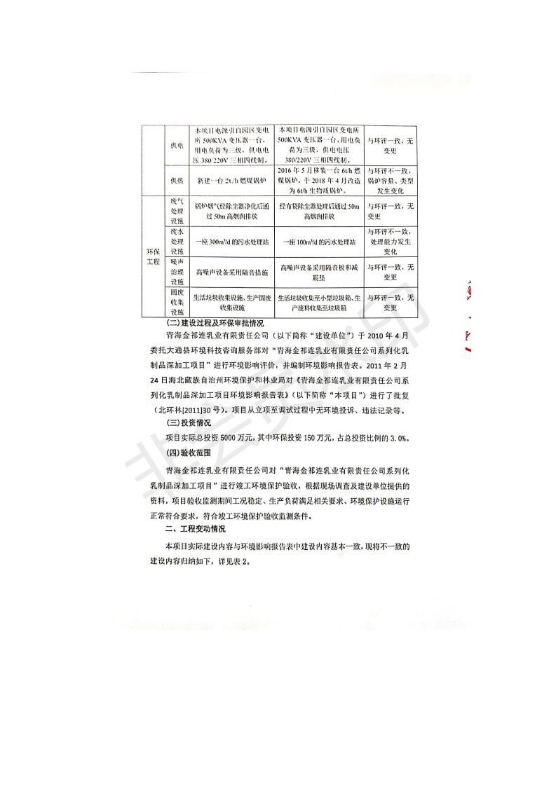 根據(jù)中華人民共和國國務(wù)院令第682號(hào)《國務(wù)院關(guān)于修改〈建設(shè)項(xiàng)目環(huán)境保護(hù)管理?xiàng)l例〉的決定》和《建設(shè)項(xiàng)目竣工環(huán)境保護(hù)驗(yàn)收暫行辦法》(國務(wù)院令682號(hào)),青海金祁連乳業(yè)有限責(zé)任公司系列化乳制品深加工項(xiàng)目(包括竣工環(huán)境保護(hù)驗(yàn)收監(jiān)測報(bào)告表和驗(yàn)收意見)公示如下。 一、項(xiàng)目名稱:青海金祁連乳業(yè)有限責(zé)任公司系列化乳制品深加工項(xiàng)目 二、地點(diǎn):海北藏族自治州祁連縣冰溝農(nóng)牧產(chǎn)業(yè)化生態(tài)園區(qū) 三、建設(shè)單位:青海金祁連乳業(yè)有限責(zé)任公司 四、建設(shè)內(nèi)容:本項(xiàng)目新征工業(yè)用地40畝,新建生產(chǎn)車間2200 m2、采用多聯(lián)跨鋼結(jié)構(gòu)廠房,跨度為24米,長度為80米,柱間距為6米,標(biāo)高為4.8米。廠房內(nèi)部根據(jù)產(chǎn)品生產(chǎn)工藝及工序要求分為不同的工作區(qū)域和車間辦公室。建設(shè)有保鮮冷庫800 m2、普通倉庫500m2、污水處理站房160 m2、鍋爐房和配電室159 m2、綜合辦公樓1200 m2、職工食堂和宿舍500 m2、其他輔助用房35 m2、蓄水池100 m2以及與土建工程相關(guān)聯(lián)的水、電、熱官網(wǎng)等輔助設(shè)施。 五、聯(lián)系人:張工 六、聯(lián)系電 話:0971-6515411 七、公示時(shí)間:二〇一九年七月十日至二〇一九年八月六日 公示期間,對(duì)上述公示內(nèi)容如有異議,請(qǐng)以書面形式反饋,個(gè)人須署真實(shí)姓名,單位須加蓋公章。
