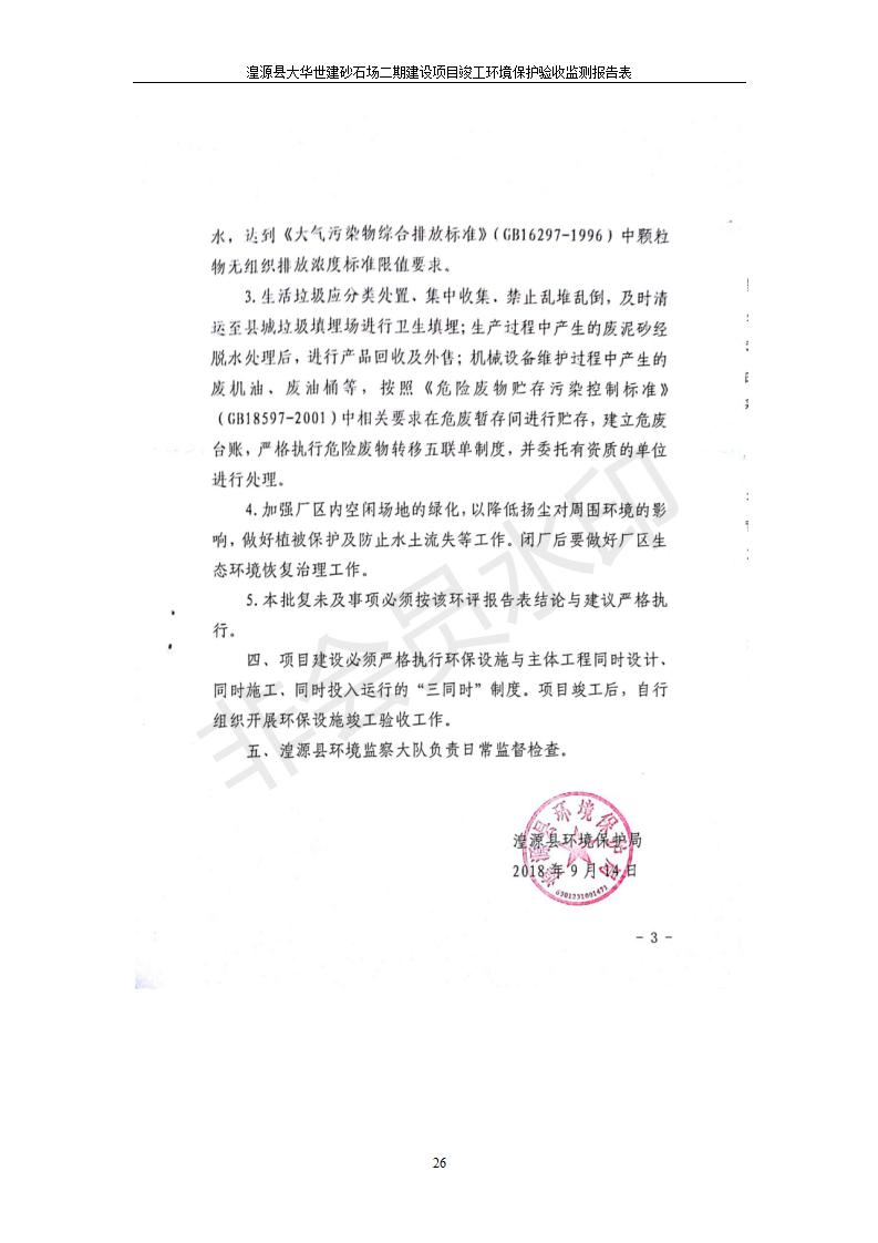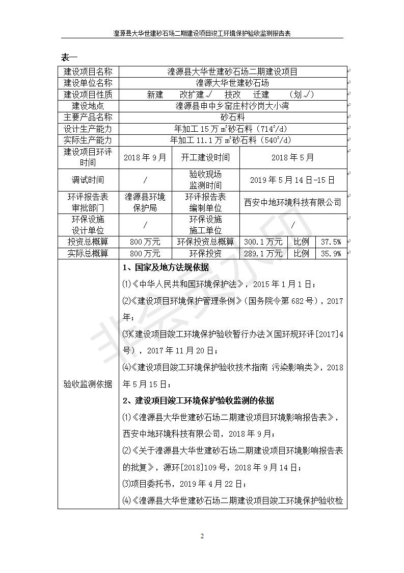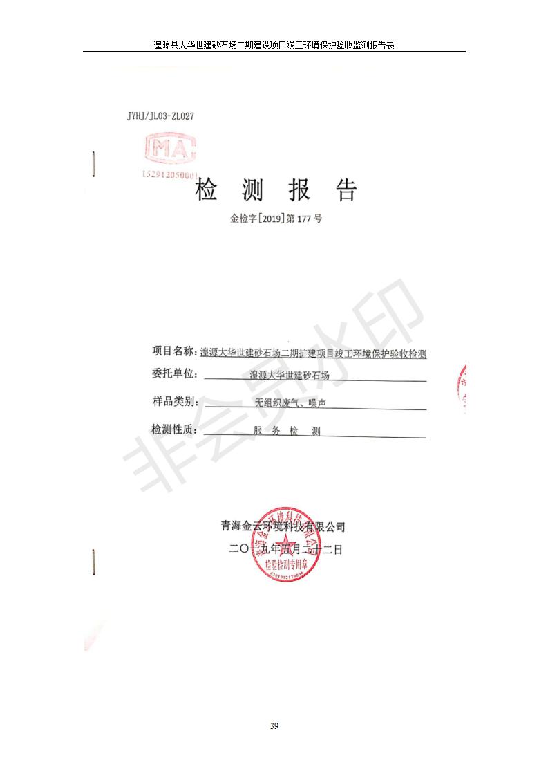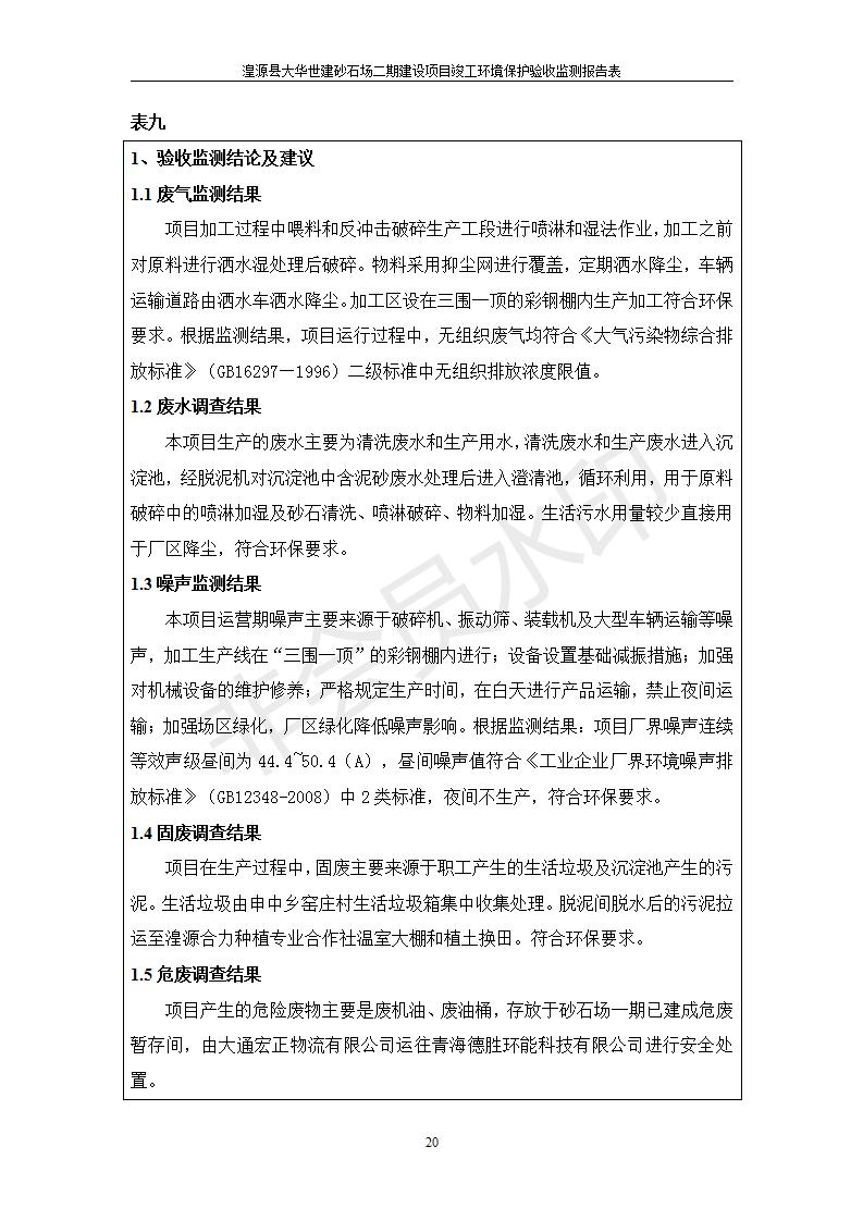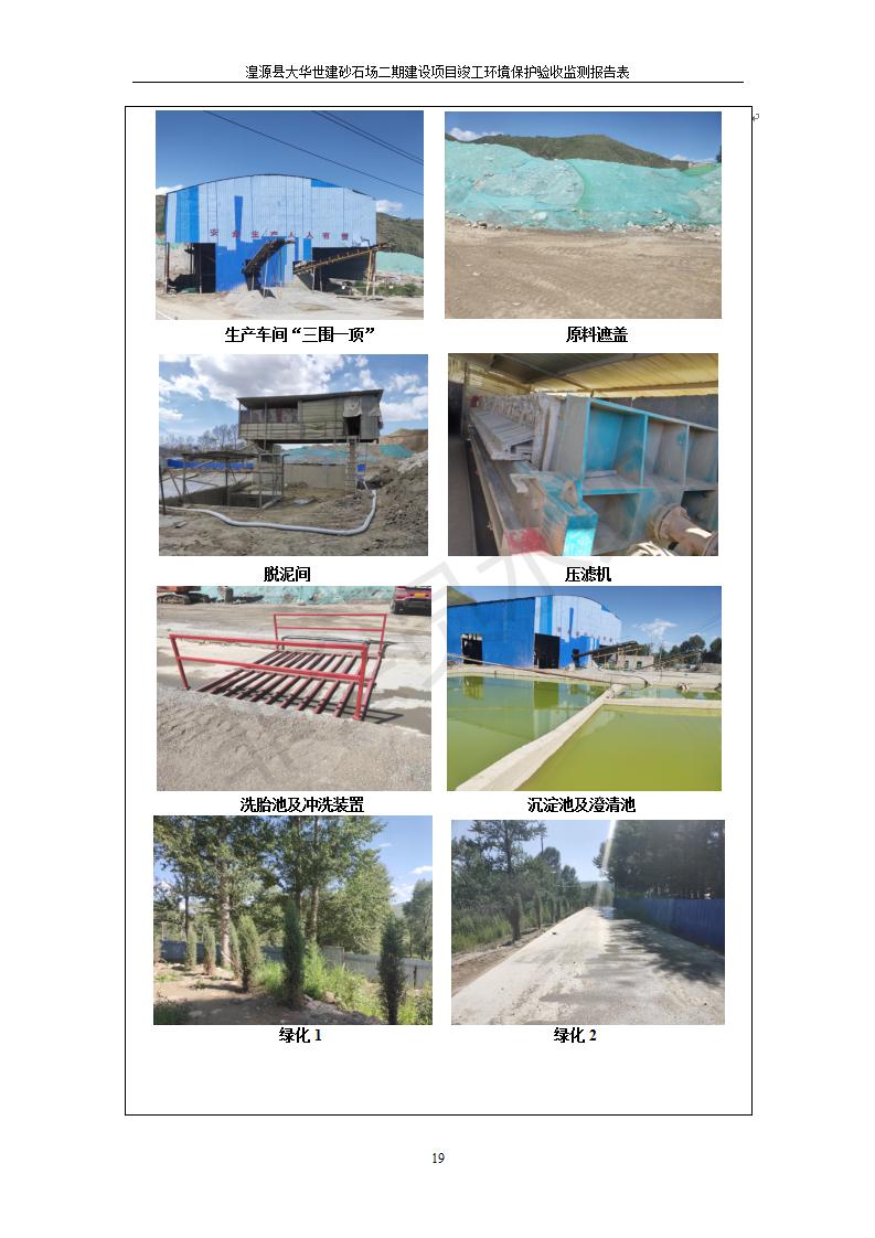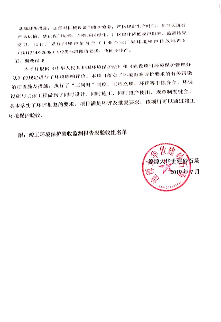 根據(jù)中華人民共和國(guó)國(guó)務(wù)院令第682號(hào)《國(guó)務(wù)院關(guān)于修改〈建設(shè)項(xiàng)目環(huán)境保護(hù)管理?xiàng)l例〉的決定》和《建設(shè)項(xiàng)目竣工環(huán)境保護(hù)驗(yàn)收暫行辦法》(國(guó)務(wù)院令682號(hào)),湟源大華世建砂石場(chǎng)湟源縣大華世建砂石場(chǎng)二期建設(shè)項(xiàng)目(包括竣工環(huán)境保護(hù)驗(yàn)收監(jiān)測(cè)報(bào)告表和驗(yàn)收意見(jiàn))公示如下。 一、項(xiàng)目名稱(chēng):湟源縣大華世建砂石場(chǎng)二期建設(shè)項(xiàng)目 二、地點(diǎn):湟源縣申中鄉(xiāng)窯莊村沙崗大小灣 三、建設(shè)單位:湟源大華世建砂石場(chǎng) 四、建設(shè)內(nèi)容:項(xiàng)目主要建設(shè)砂石料產(chǎn)品加工生產(chǎn)區(qū)、原料堆場(chǎng)、產(chǎn)品堆場(chǎng)、辦公區(qū)等。五、聯(lián)系人:張工 六、聯(lián)系電 話(huà):0971-6515411 七、公示時(shí)間:二〇一九年七月二十五日至二〇一九年八月二十一日公示期間,對(duì)上述公示內(nèi)容如有異議,請(qǐng)以書(shū)面形式反饋,個(gè)人須署真實(shí)姓名,單位須加蓋公章。