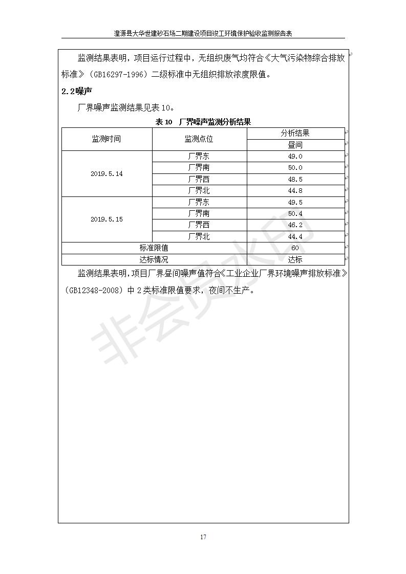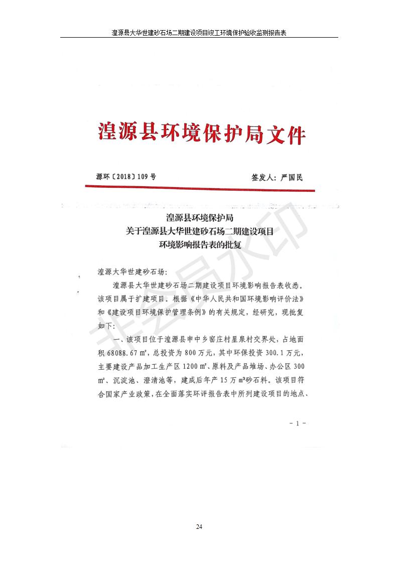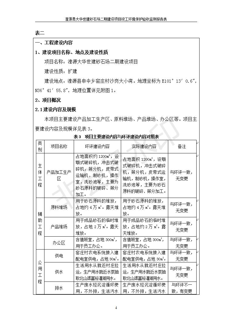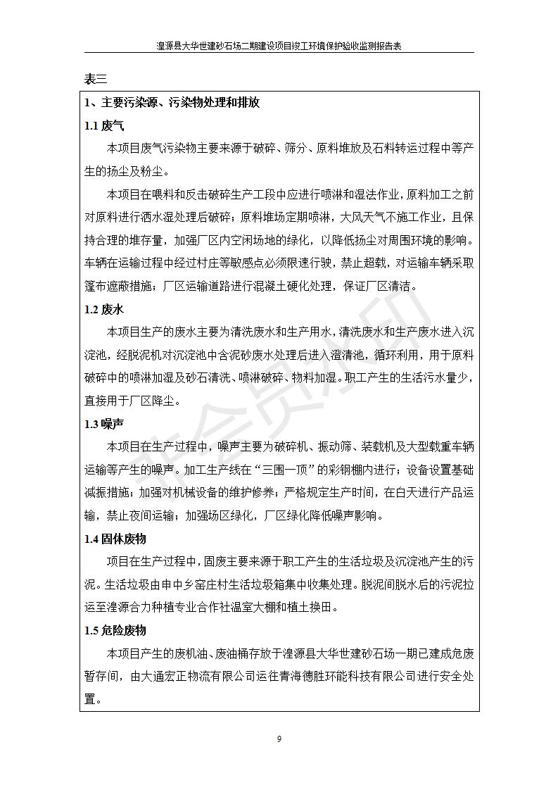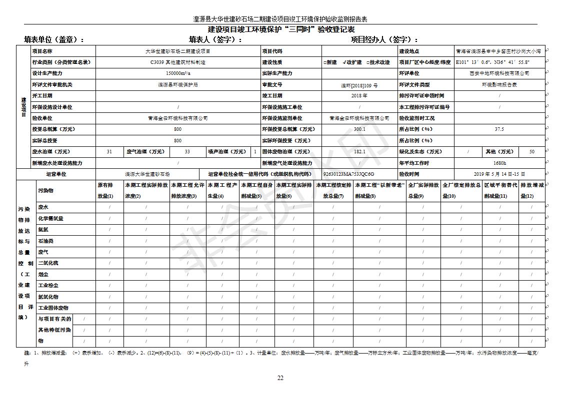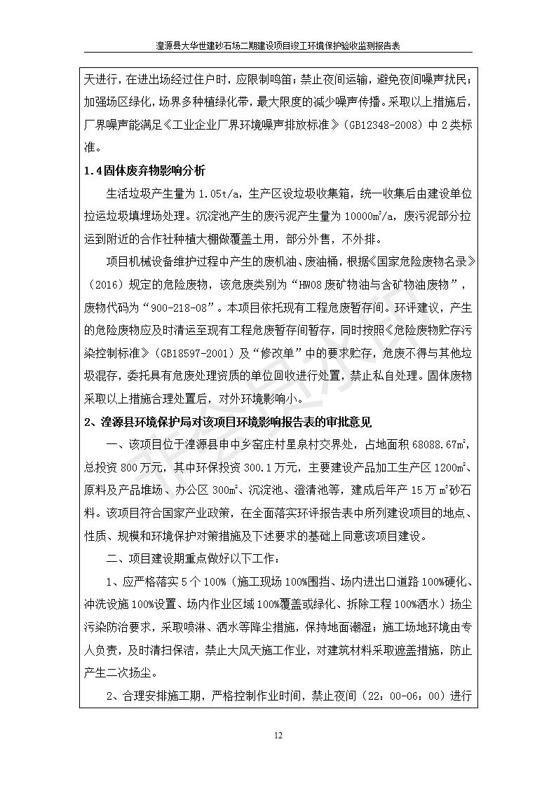 根據(jù)中華人民共和國(guó)國(guó)務(wù)院令第682號(hào)《國(guó)務(wù)院關(guān)于修改〈建設(shè)項(xiàng)目環(huán)境保護(hù)管理?xiàng)l例〉的決定》和《建設(shè)項(xiàng)目竣工環(huán)境保護(hù)驗(yàn)收暫行辦法》(國(guó)務(wù)院令682號(hào)),湟源大華世建砂石場(chǎng)湟源縣大華世建砂石場(chǎng)二期建設(shè)項(xiàng)目(包括竣工環(huán)境保護(hù)驗(yàn)收監(jiān)測(cè)報(bào)告表和驗(yàn)收意見(jiàn))公示如下。 一、項(xiàng)目名稱(chēng):湟源縣大華世建砂石場(chǎng)二期建設(shè)項(xiàng)目 二、地點(diǎn):湟源縣申中鄉(xiāng)窯莊村沙崗大小灣 三、建設(shè)單位:湟源大華世建砂石場(chǎng) 四、建設(shè)內(nèi)容:項(xiàng)目主要建設(shè)砂石料產(chǎn)品加工生產(chǎn)區(qū)、原料堆場(chǎng)、產(chǎn)品堆場(chǎng)、辦公區(qū)等。五、聯(lián)系人:張工 六、聯(lián)系電 話(huà):0971-6515411 七、公示時(shí)間:二〇一九年七月二十五日至二〇一九年八月二十一日公示期間,對(duì)上述公示內(nèi)容如有異議,請(qǐng)以書(shū)面形式反饋,個(gè)人須署真實(shí)姓名,單位須加蓋公章。