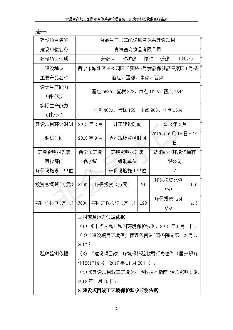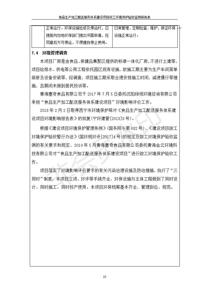 根據(jù)中華人民共和國國務院令第682號《國務院關于修改〈建設項目環(huán)境保護管理條例〉的決定》和《建設項目竣工環(huán)境保護驗收暫行辦法》(國務院令682號),食品生產加工配送服務體系建設項目(包括竣工環(huán)境保護驗收監(jiān)測報告表和驗收意見)公示如下。 一、項目名稱:食品生產加工配送服務體系建設項目 二、地點:西寧市城北區(qū)生物園區(qū)迎新路5號食品保健品集聚區(qū)1號樓 六、聯(lián)系電 話:0971-6515411 七、公示時間:二〇一九年九月二十日至二〇一九年十月二十二日 公示期間,對上述公示內容如有異議,請以書面形式反饋,個人須署真實姓名,單位須加蓋公章。