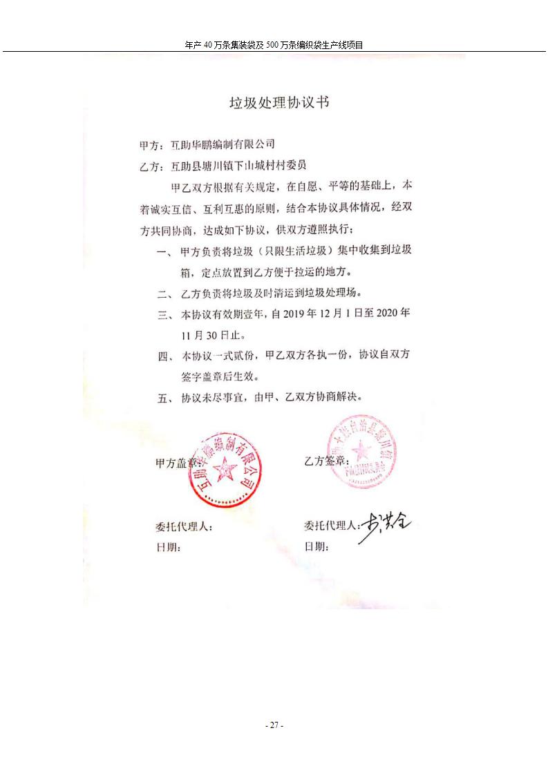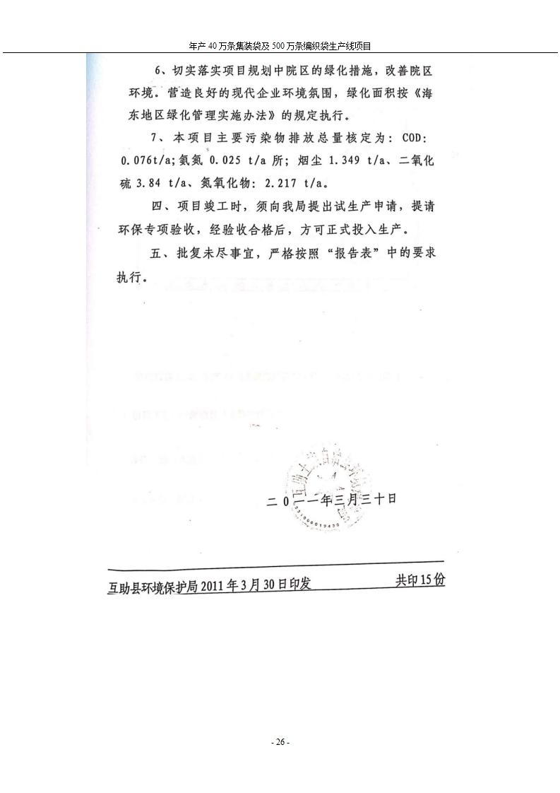 根據(jù)中華人民共和國國務(wù)院令第682號《國務(wù)院關(guān)于修改〈建設(shè)項(xiàng)目環(huán)境保護(hù)管理?xiàng)l例〉的決定》和《建設(shè)項(xiàng)目竣工環(huán)境保護(hù)驗(yàn)收暫行辦法》(國務(wù)院令682號),年產(chǎn)40萬條集裝袋及500萬條編織袋生產(chǎn)線項(xiàng)目(包括竣工環(huán)境保護(hù)驗(yàn)收調(diào)查表和驗(yàn)收意見)公示如下。 一、項(xiàng)目名稱: 年產(chǎn)40萬條集裝袋及500萬條編織袋生產(chǎn)線項(xiàng)目 二、地點(diǎn):互助縣塘川鎮(zhèn)下山城村 五、聯(lián)系人:張工 六、聯(lián)系電話:0971-6515411 七、公示時間:二〇二〇年一月十三日至二〇二〇年二月十二日 公示期間,對上述公示內(nèi)容如有異議,請以書面形式反饋,個人須署真實(shí)姓名,單位須加蓋公章。