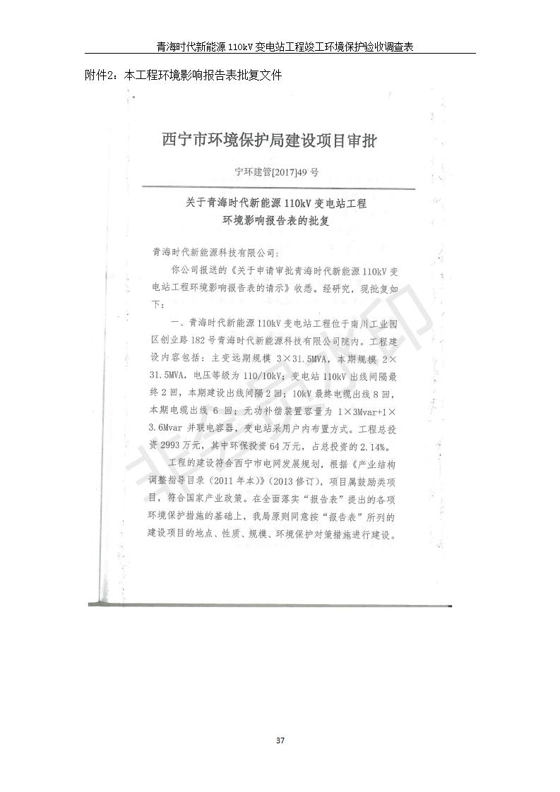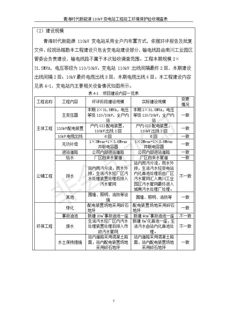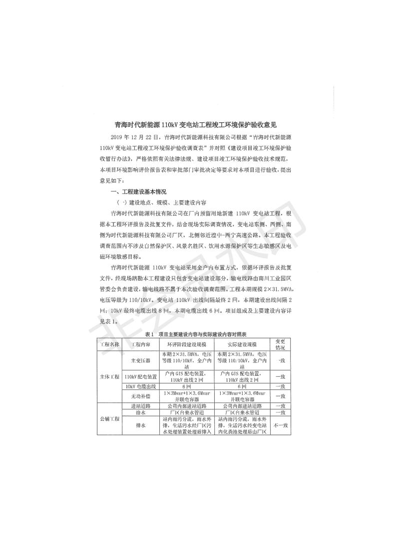 根據(jù)中華人民共和國國務(wù)院令第682號《國務(wù)院關(guān)于修改〈建設(shè)項(xiàng)目環(huán)境保護(hù)管理?xiàng)l例〉的決定》和《建設(shè)項(xiàng)目竣工環(huán)境保護(hù)驗(yàn)收暫行辦法》(國務(wù)院令682號),青海時代新能源110kV變電站工程(包括竣工環(huán)境保護(hù)驗(yàn)收調(diào)查表和驗(yàn)收意見)公示如下。 一、項(xiàng)目名稱:青海時代新能源110kV變電站工程 二、地點(diǎn):青海省西寧市南川工業(yè)園區(qū)創(chuàng)業(yè)路182號青海時代新能源科技有限公司廠區(qū)內(nèi) 三、建設(shè)單位:青海時代新能源科技有限公司 四、建設(shè)內(nèi)容:青海時代新能源 110kV 變電站采用全戶內(nèi)布置方式,依據(jù)環(huán)評報(bào)告及批復(fù)文件,經(jīng)現(xiàn)場踏勘本工程建設(shè)只包含變電站建設(shè)部分,輸電線路由南川工業(yè)園區(qū)管委會負(fù)責(zé)建設(shè),輸電線路不屬于本次驗(yàn)收調(diào)查范圍。工程本期規(guī)模2×31.5MVA,電壓等級為110/10kV。變電站 110kV 出線間隔最終2回,本期建設(shè)出線間隔2回;10kV最終電纜出線8回,本期電纜出線6回。 五、聯(lián)系人:張工 六、聯(lián)系電話:0971-6515411 七、公示時間:二〇二〇年一月十四日至二〇二〇年二月十三日 公示期間,對上述公示內(nèi)容如有異議,請以書面形式反饋,個人須署真實(shí)姓名,單位須加蓋公章。