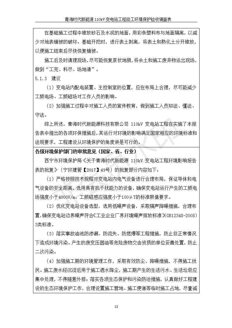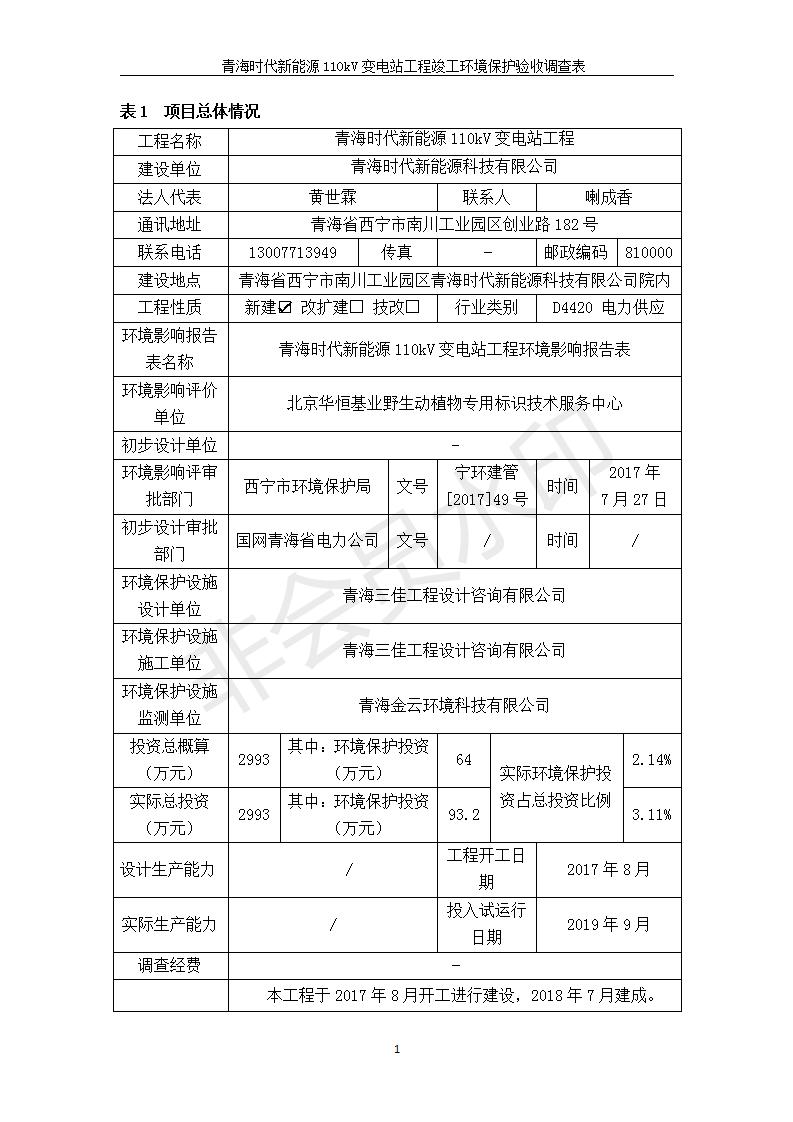 青海時代新能源110kV變電站工程竣工環(huán)境保護(hù)驗(yàn)收調(diào)查表公示發(fā)布日期:(2020-1-14) 點(diǎn)擊次數(shù):2670 |