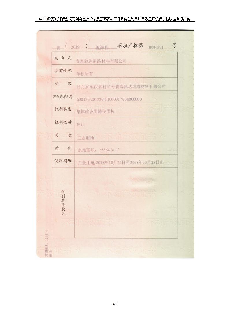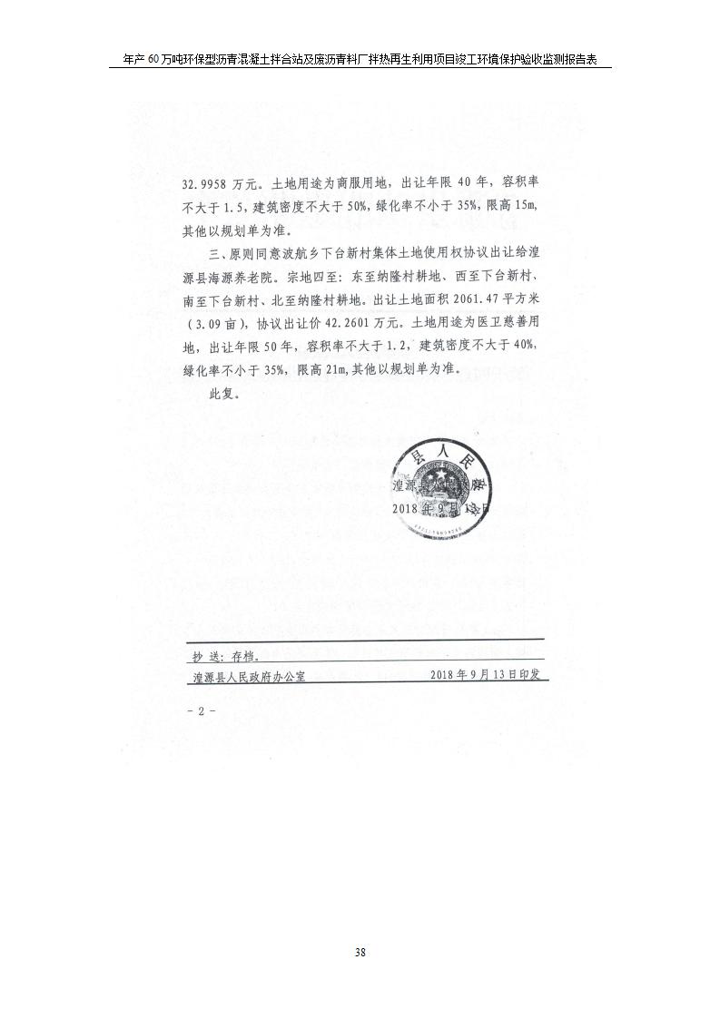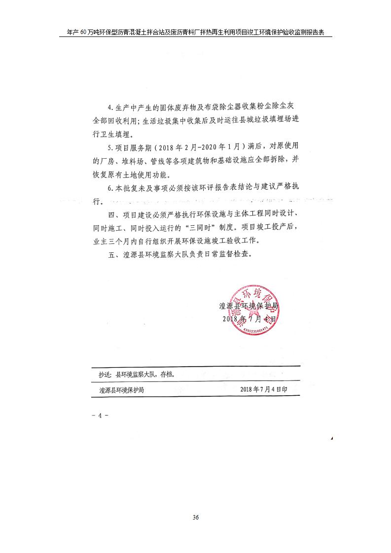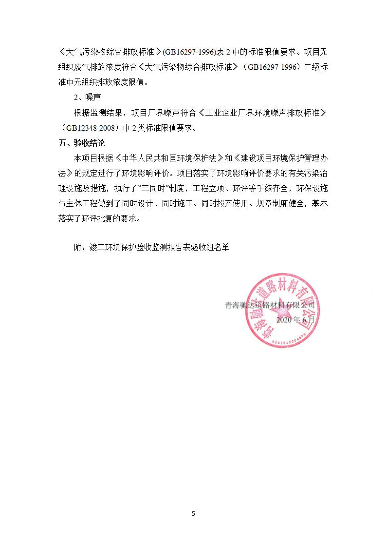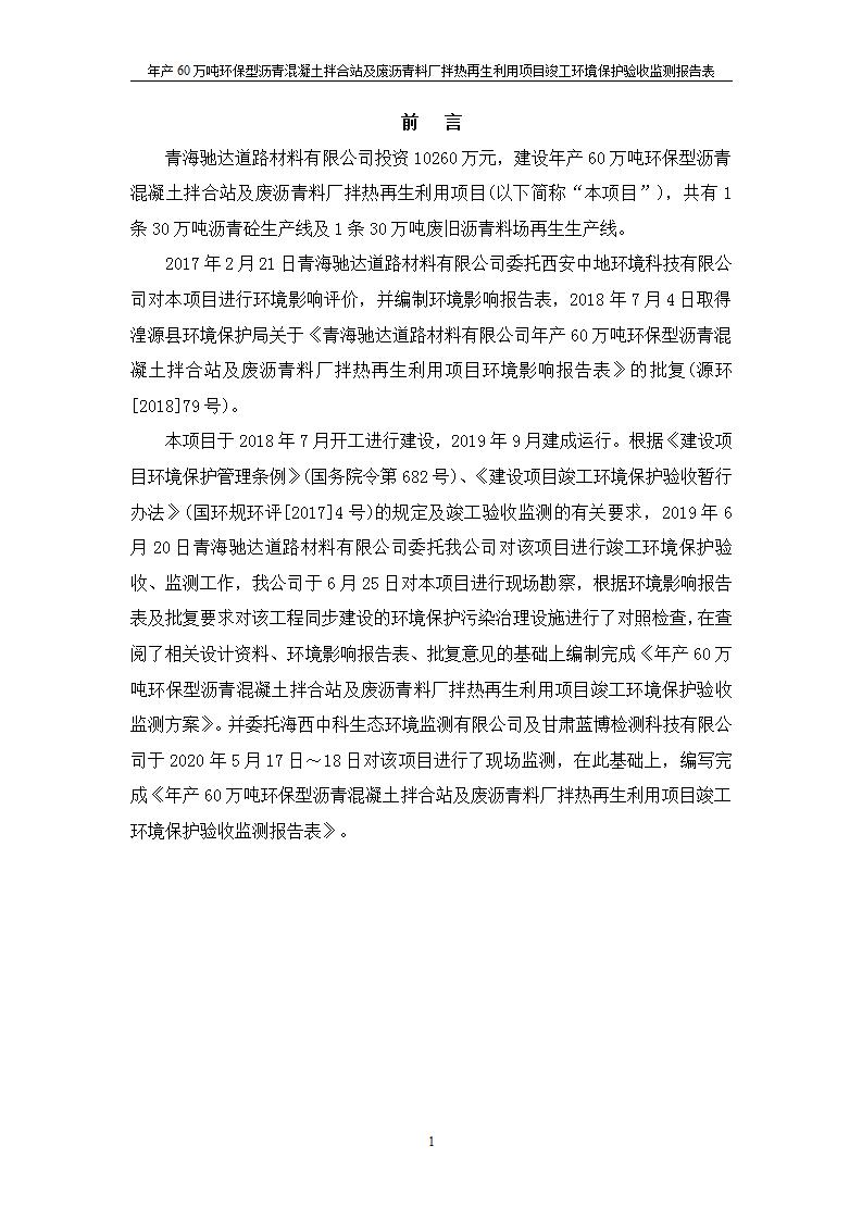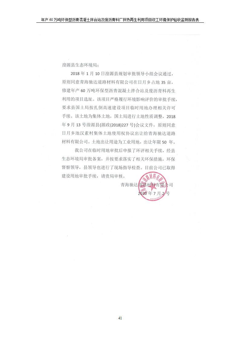 根據(jù)中華人民共和國國務(wù)院令第682號(hào)《國務(wù)院關(guān)于修改〈建設(shè)項(xiàng)目環(huán)境保護(hù)管理?xiàng)l例〉的決定》和《建設(shè)項(xiàng)目竣工環(huán)境保護(hù)驗(yàn)收暫行辦法》(國務(wù)院令682號(hào)),青海馳達(dá)道路材料有限公司年產(chǎn)60萬噸環(huán)保型瀝青混凝土拌合站及廢瀝青料廠拌熱再生利用項(xiàng)目竣工環(huán)境保護(hù)驗(yàn)收監(jiān)測(cè)報(bào)告表公示如下。 一、項(xiàng)目名稱:年產(chǎn)60萬噸環(huán)保型瀝青混凝土拌合站及廢瀝青料廠拌熱再生利用項(xiàng)目竣工環(huán)境保護(hù)驗(yàn)收監(jiān)測(cè)報(bào)告表 二、地點(diǎn):湟源縣日月藏族鄉(xiāng)池漢素村 三、建設(shè)單位:青海馳達(dá)道路材料有限公司 四、建設(shè)內(nèi)容:本項(xiàng)目共有2條瀝青砼生產(chǎn)線及1條穩(wěn)定土生產(chǎn)線,配套辦公樓等。 五、聯(lián)系人:楊工 六、聯(lián)系電 話:0971-6515411 七、公示時(shí)間:二〇二〇年七月六日至二〇二〇年七月三十一日 公示期間,對(duì)上述公示內(nèi)容如有異議,請(qǐng)以書面形式反饋,個(gè)人須署真實(shí)姓名,單位須加蓋公章。