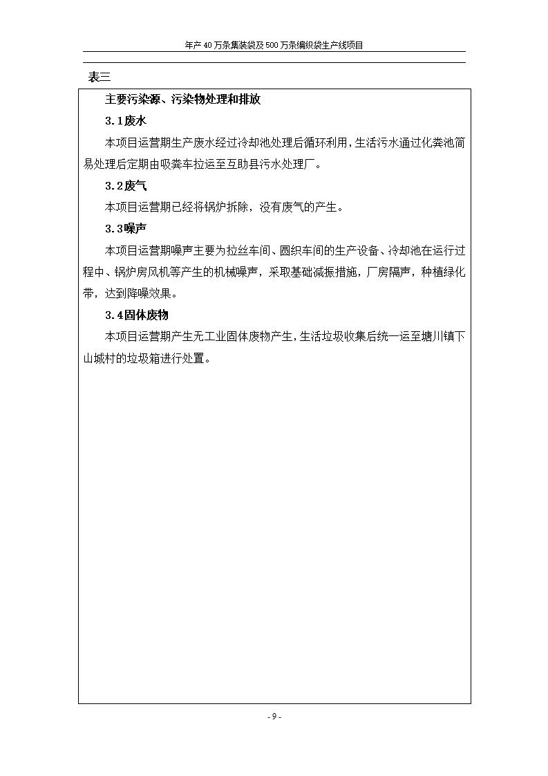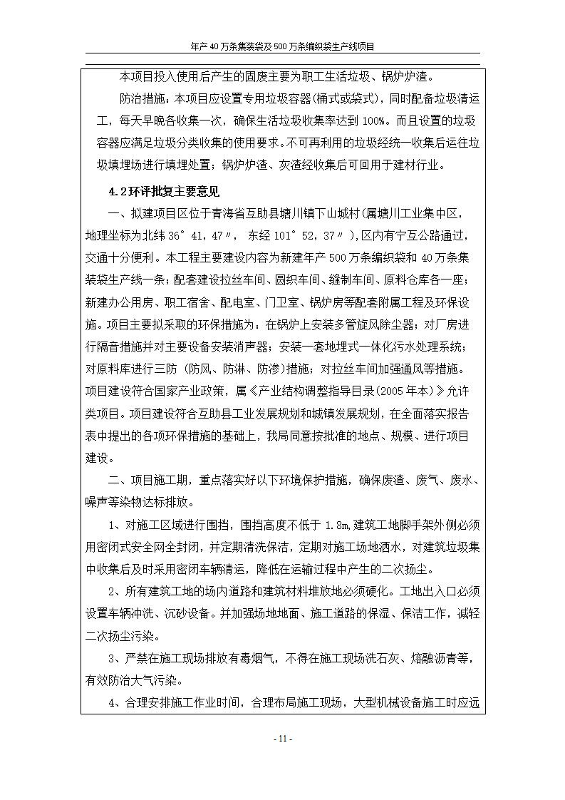 根據(jù)中華人民共和國國務(wù)院令第682號《國務(wù)院關(guān)于修改〈建設(shè)項(xiàng)目環(huán)境保護(hù)管理?xiàng)l例〉的決定》和《建設(shè)項(xiàng)目竣工環(huán)境保護(hù)驗(yàn)收暫行辦法》(國務(wù)院令682號),年產(chǎn)40萬條集裝袋及500萬條編織袋生產(chǎn)線項(xiàng)目(包括竣工環(huán)境保護(hù)驗(yàn)收調(diào)查表和驗(yàn)收意見)公示如下。 一、項(xiàng)目名稱: 年產(chǎn)40萬條集裝袋及500萬條編織袋生產(chǎn)線項(xiàng)目 二、地點(diǎn):互助縣塘川鎮(zhèn)下山城村 五、聯(lián)系人:張工 六、聯(lián)系電話:0971-6515411 七、公示時(shí)間:二〇二〇年一月十三日至二〇二〇年二月十二日 公示期間,對上述公示內(nèi)容如有異議,請以書面形式反饋,個(gè)人須署真實(shí)姓名,單位須加蓋公章。