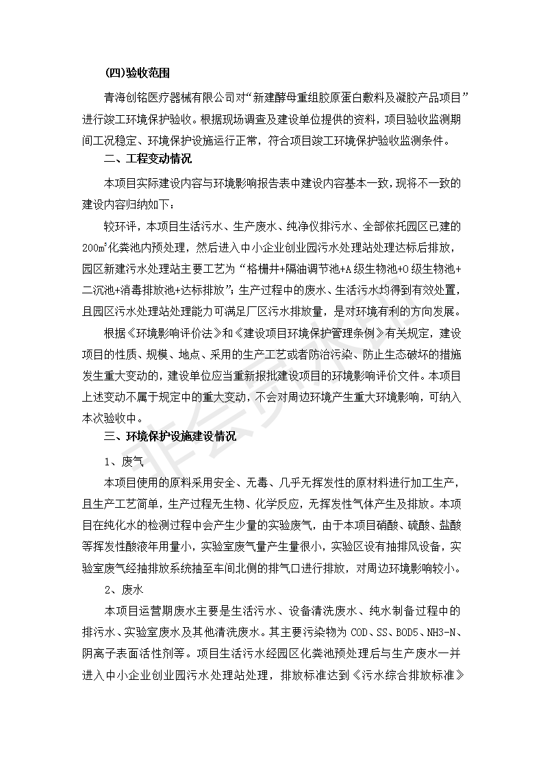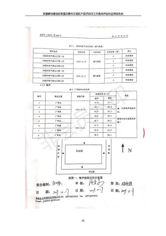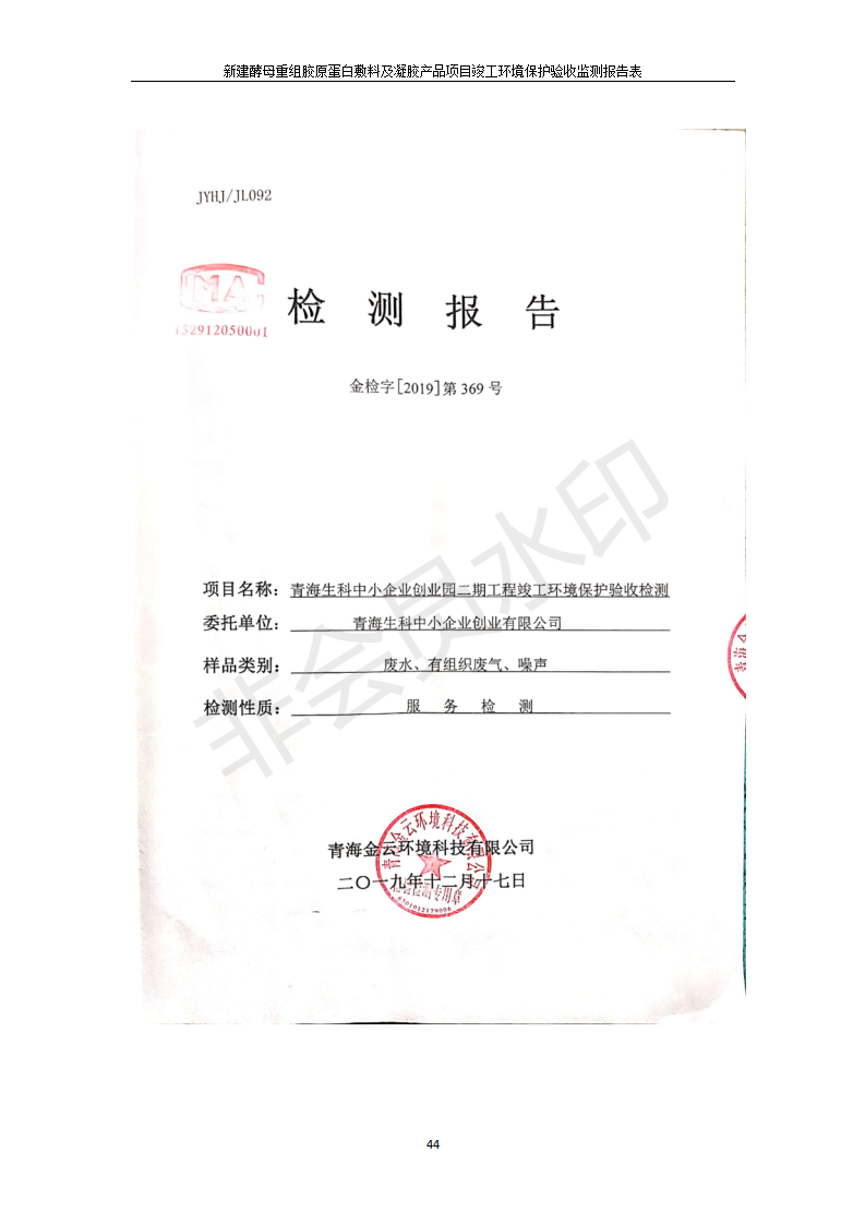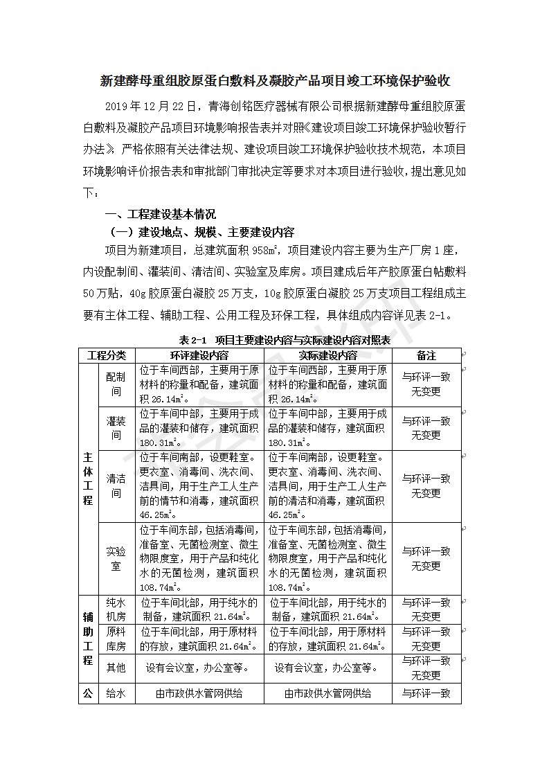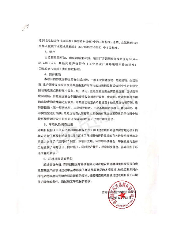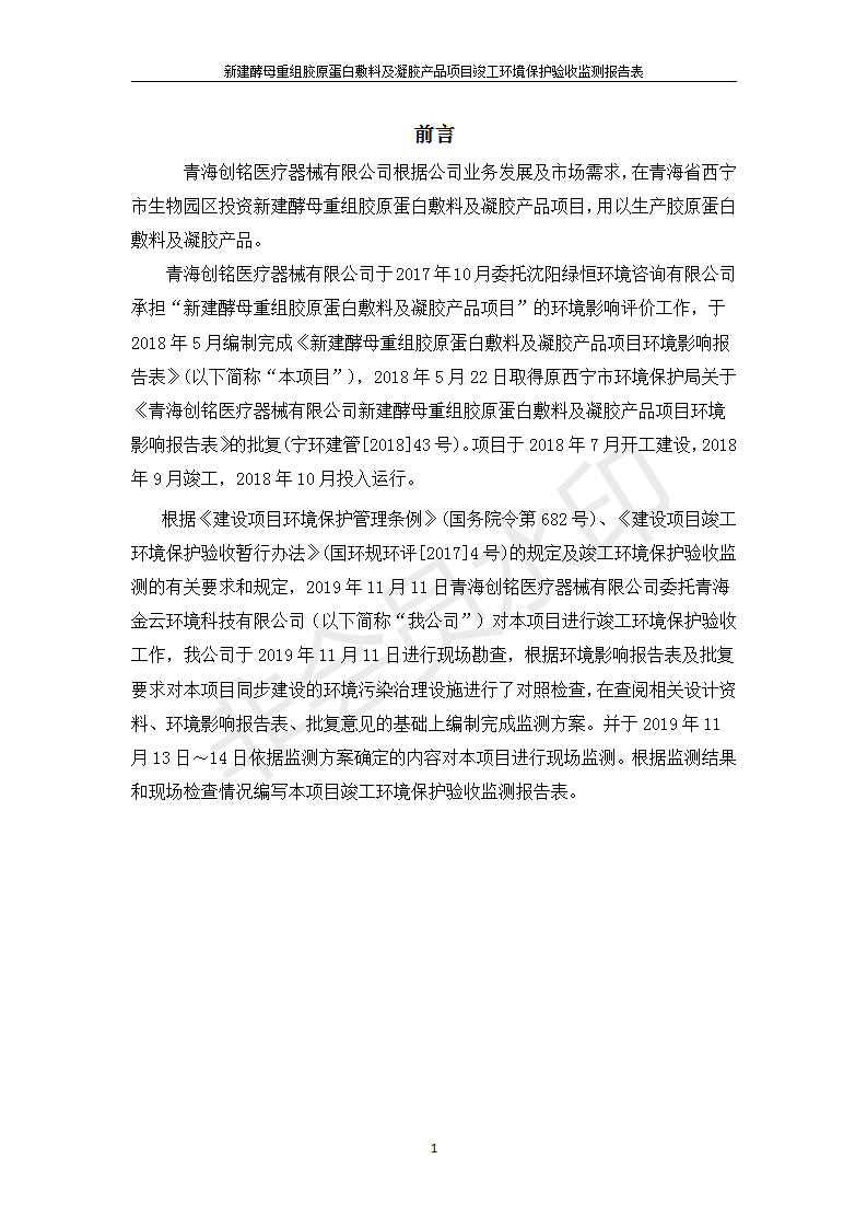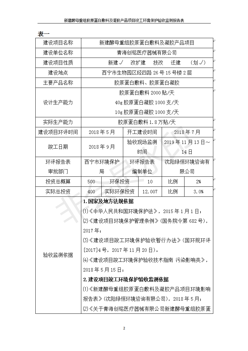 根據(jù)中華人民共和國國務(wù)院令第682號(hào)《國務(wù)院關(guān)于修改〈建設(shè)項(xiàng)目環(huán)境保護(hù)管理?xiàng)l例〉的決定》和《建設(shè)項(xiàng)目竣工環(huán)境保護(hù)驗(yàn)收暫行辦法》(國務(wù)院令682號(hào)),新建酵母重組膠原蛋白敷料及凝膠產(chǎn)品項(xiàng)目(包括竣工環(huán)境保護(hù)驗(yàn)收監(jiān)測報(bào)告表和驗(yàn)收意見)公示如下。 一、項(xiàng)目名稱:新建酵母重組膠原蛋白敷料及凝膠產(chǎn)品項(xiàng)目 二、地點(diǎn):西寧市生物園區(qū)經(jīng)四路26號(hào)15號(hào)樓2層 五、聯(lián)系人:董繼風(fēng) 六、聯(lián)系電話:18606125050 七、公示時(shí)間:二〇二〇年一月十三日至二〇二〇年二月十二日 公示期間,對上述公示內(nèi)容如有異議,請以書面形式反饋,個(gè)人須署真實(shí)姓名,單位須加蓋公章。