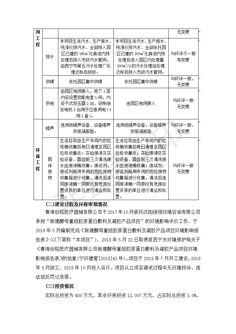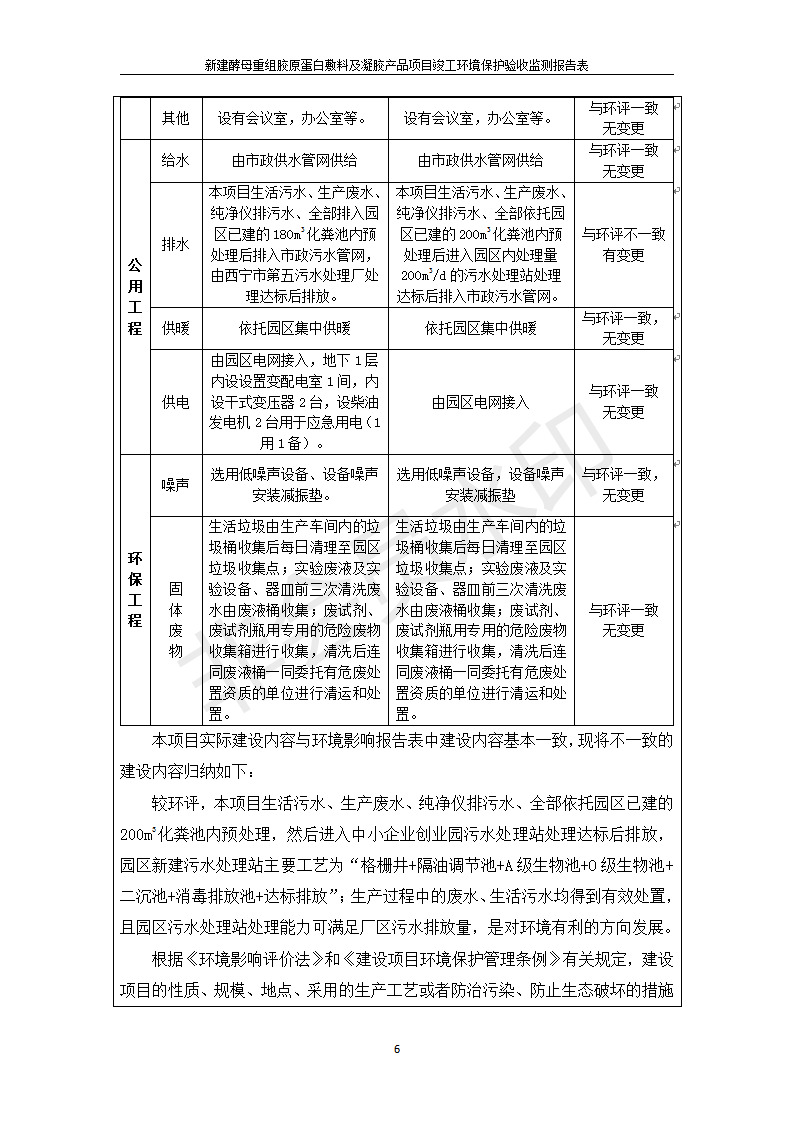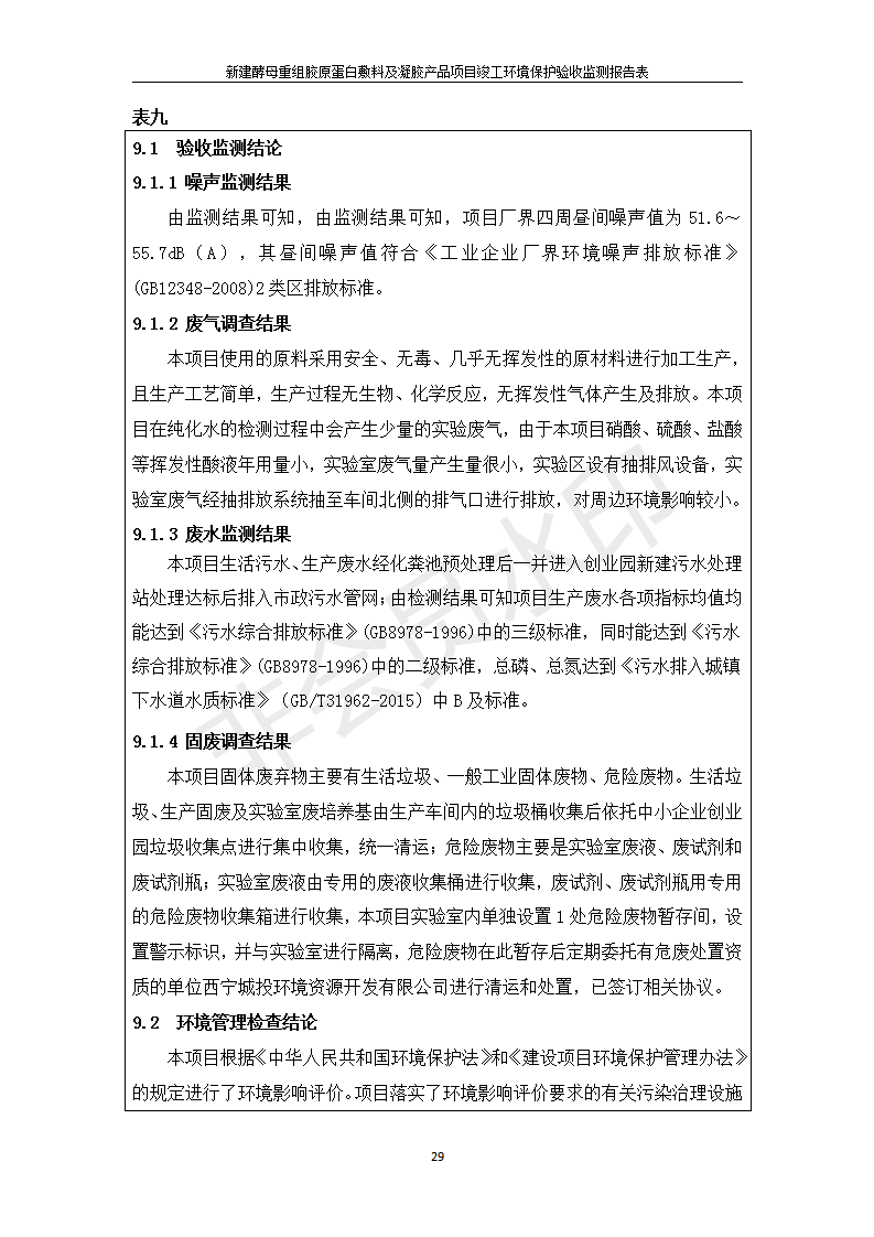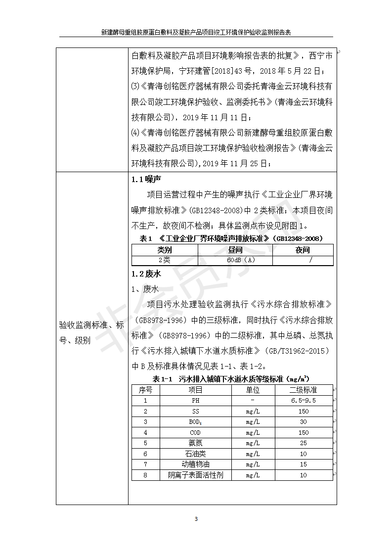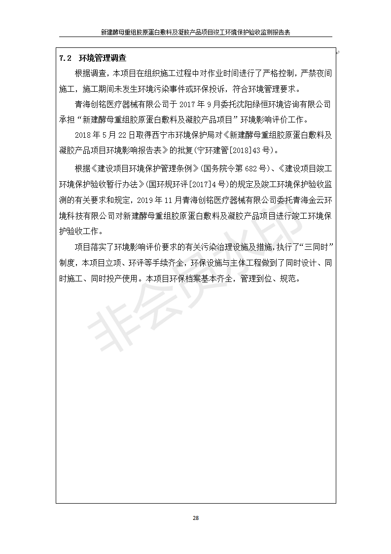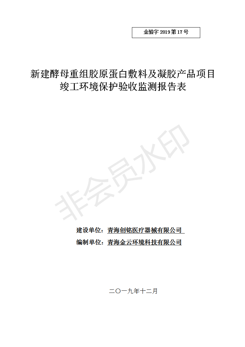 根據(jù)中華人民共和國國務(wù)院令第682號(hào)《國務(wù)院關(guān)于修改〈建設(shè)項(xiàng)目環(huán)境保護(hù)管理?xiàng)l例〉的決定》和《建設(shè)項(xiàng)目竣工環(huán)境保護(hù)驗(yàn)收暫行辦法》(國務(wù)院令682號(hào)),新建酵母重組膠原蛋白敷料及凝膠產(chǎn)品項(xiàng)目(包括竣工環(huán)境保護(hù)驗(yàn)收監(jiān)測報(bào)告表和驗(yàn)收意見)公示如下。 一、項(xiàng)目名稱:新建酵母重組膠原蛋白敷料及凝膠產(chǎn)品項(xiàng)目 二、地點(diǎn):西寧市生物園區(qū)經(jīng)四路26號(hào)15號(hào)樓2層 五、聯(lián)系人:董繼風(fēng) 六、聯(lián)系電話:18606125050 七、公示時(shí)間:二〇二〇年一月十三日至二〇二〇年二月十二日 公示期間,對上述公示內(nèi)容如有異議,請以書面形式反饋,個(gè)人須署真實(shí)姓名,單位須加蓋公章。