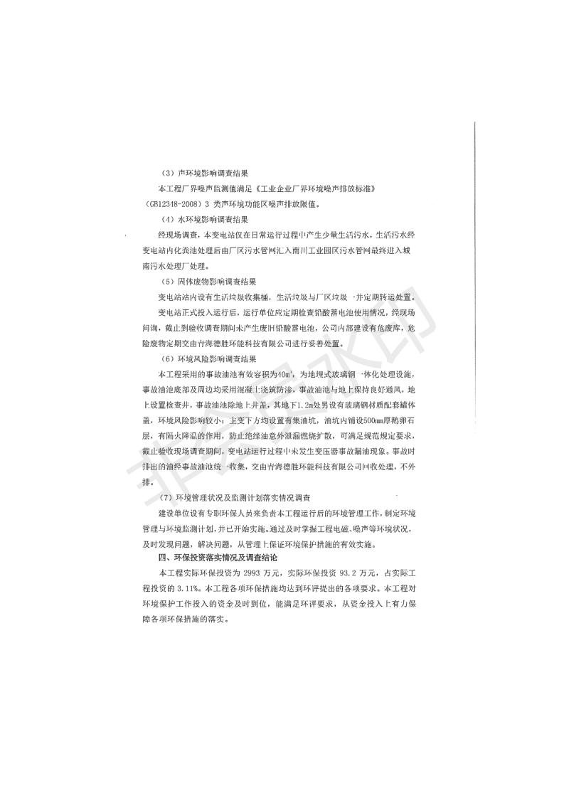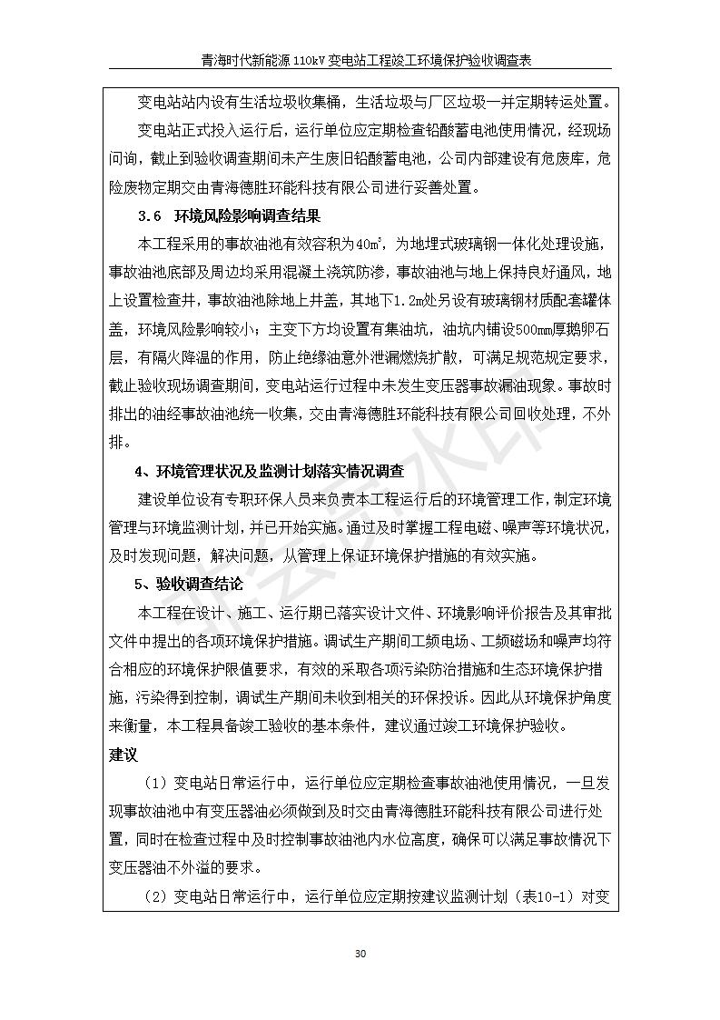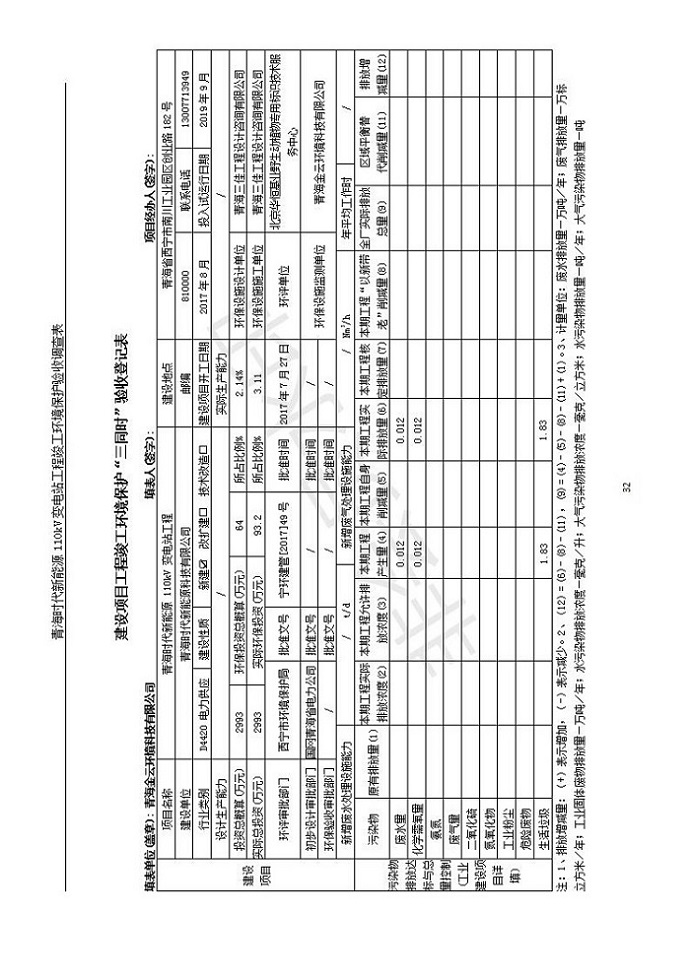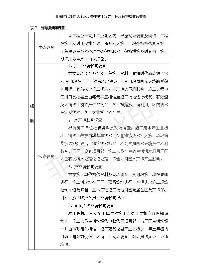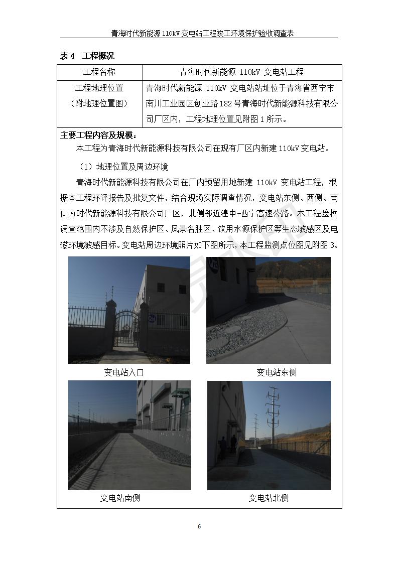 根據(jù)中華人民共和國國務(wù)院令第682號《國務(wù)院關(guān)于修改〈建設(shè)項目環(huán)境保護管理條例〉的決定》和《建設(shè)項目竣工環(huán)境保護驗收暫行辦法》(國務(wù)院令682號),青海時代新能源110kV變電站工程(包括竣工環(huán)境保護驗收調(diào)查表和驗收意見)公示如下。 一、項目名稱:青海時代新能源110kV變電站工程 二、地點:青海省西寧市南川工業(yè)園區(qū)創(chuàng)業(yè)路182號青海時代新能源科技有限公司廠區(qū)內(nèi) 三、建設(shè)單位:青海時代新能源科技有限公司 四、建設(shè)內(nèi)容:青海時代新能源 110kV 變電站采用全戶內(nèi)布置方式,依據(jù)環(huán)評報告及批復(fù)文件,經(jīng)現(xiàn)場踏勘本工程建設(shè)只包含變電站建設(shè)部分,輸電線路由南川工業(yè)園區(qū)管委會負(fù)責(zé)建設(shè),輸電線路不屬于本次驗收調(diào)查范圍。工程本期規(guī)模2×31.5MVA,電壓等級為110/10kV。變電站 110kV 出線間隔最終2回,本期建設(shè)出線間隔2回;10kV最終電纜出線8回,本期電纜出線6回。 五、聯(lián)系人:張工 六、聯(lián)系電話:0971-6515411 七、公示時間:二〇二〇年一月十四日至二〇二〇年二月十三日 公示期間,對上述公示內(nèi)容如有異議,請以書面形式反饋,個人須署真實姓名,單位須加蓋公章。