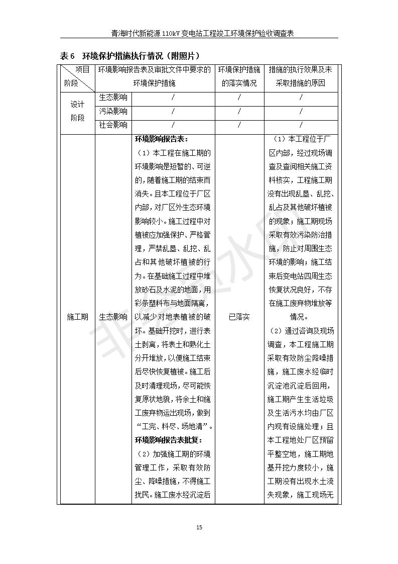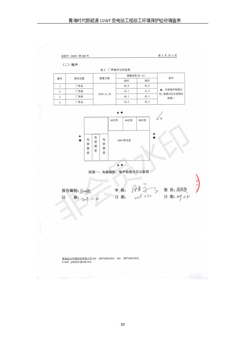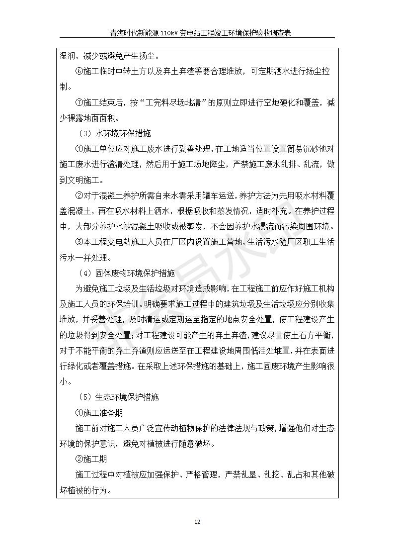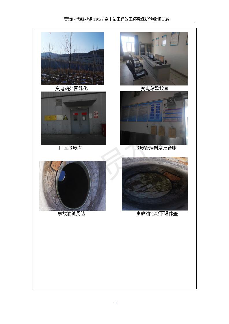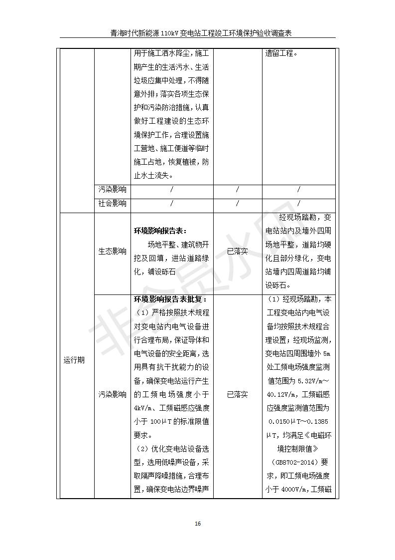 根據(jù)中華人民共和國國務(wù)院令第682號《國務(wù)院關(guān)于修改〈建設(shè)項目環(huán)境保護管理條例〉的決定》和《建設(shè)項目竣工環(huán)境保護驗收暫行辦法》(國務(wù)院令682號),青海時代新能源110kV變電站工程(包括竣工環(huán)境保護驗收調(diào)查表和驗收意見)公示如下。 一、項目名稱:青海時代新能源110kV變電站工程 二、地點:青海省西寧市南川工業(yè)園區(qū)創(chuàng)業(yè)路182號青海時代新能源科技有限公司廠區(qū)內(nèi) 三、建設(shè)單位:青海時代新能源科技有限公司 四、建設(shè)內(nèi)容:青海時代新能源 110kV 變電站采用全戶內(nèi)布置方式,依據(jù)環(huán)評報告及批復(fù)文件,經(jīng)現(xiàn)場踏勘本工程建設(shè)只包含變電站建設(shè)部分,輸電線路由南川工業(yè)園區(qū)管委會負(fù)責(zé)建設(shè),輸電線路不屬于本次驗收調(diào)查范圍。工程本期規(guī)模2×31.5MVA,電壓等級為110/10kV。變電站 110kV 出線間隔最終2回,本期建設(shè)出線間隔2回;10kV最終電纜出線8回,本期電纜出線6回。 五、聯(lián)系人:張工 六、聯(lián)系電話:0971-6515411 七、公示時間:二〇二〇年一月十四日至二〇二〇年二月十三日 公示期間,對上述公示內(nèi)容如有異議,請以書面形式反饋,個人須署真實姓名,單位須加蓋公章。