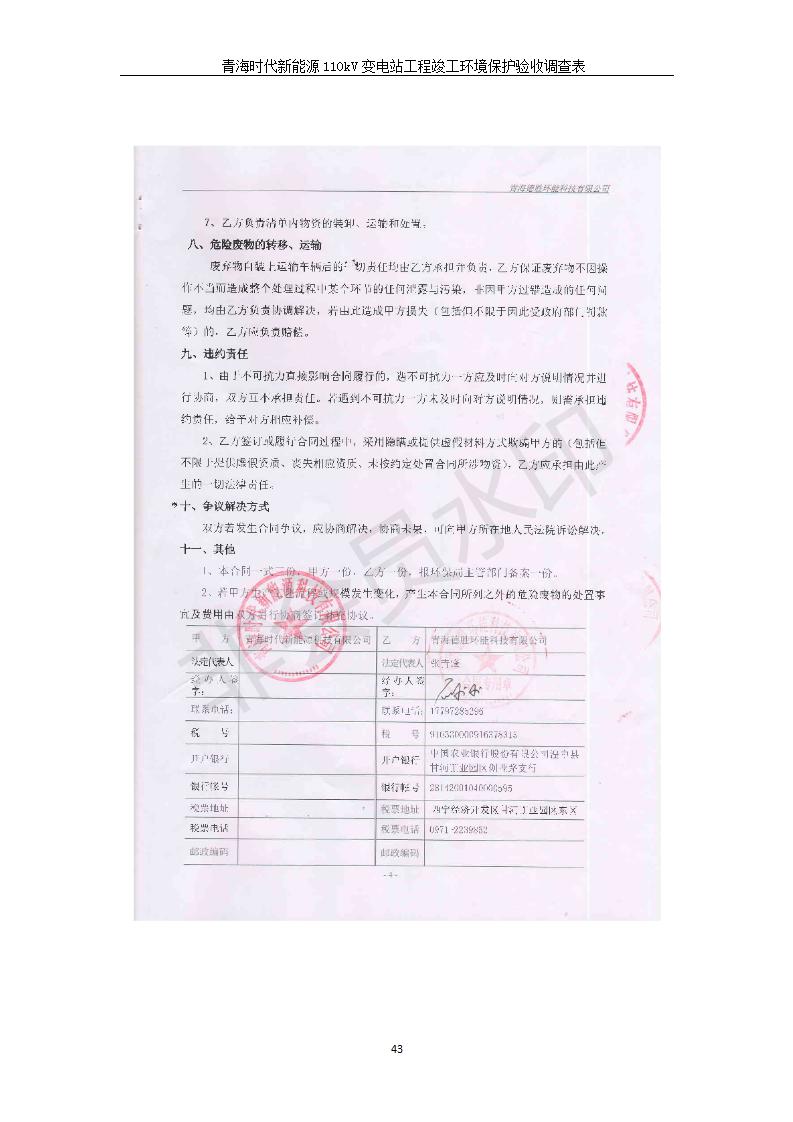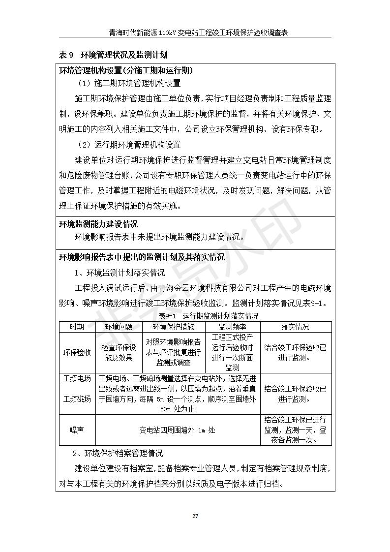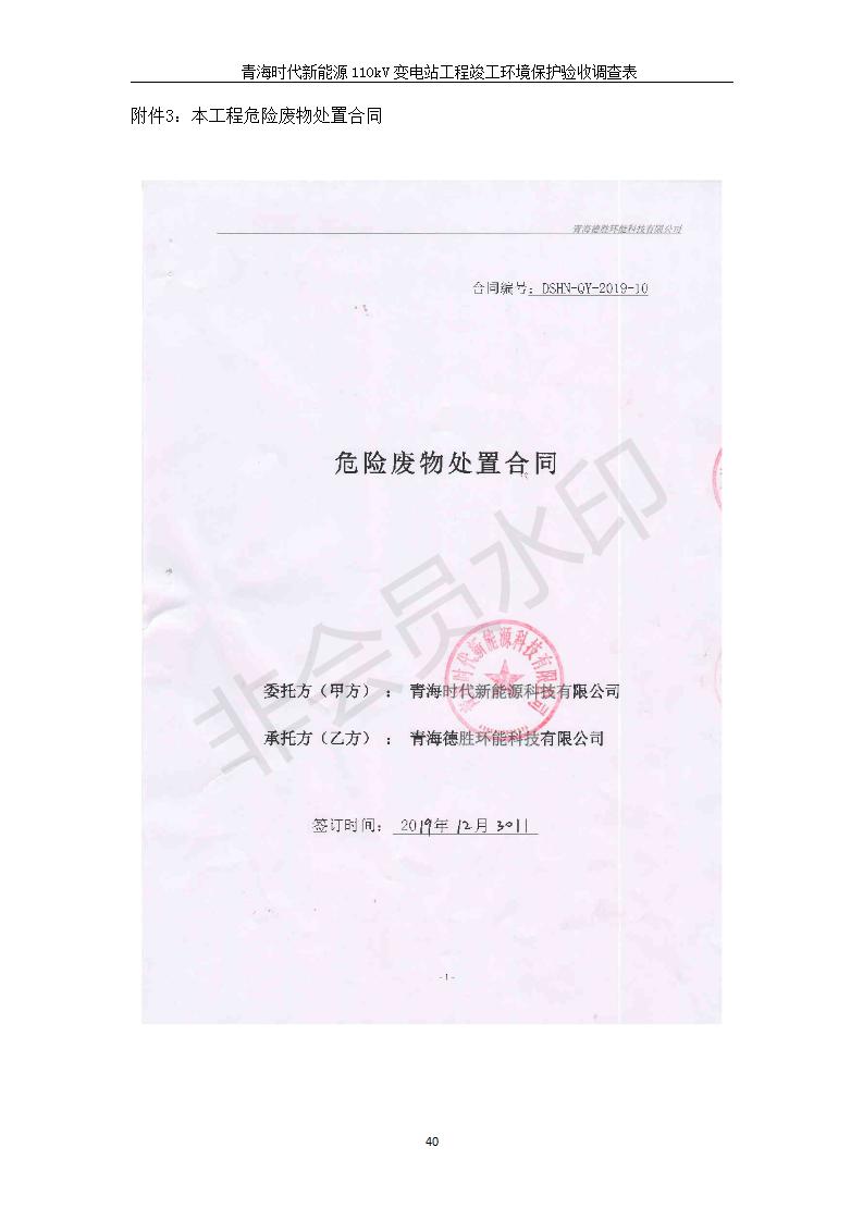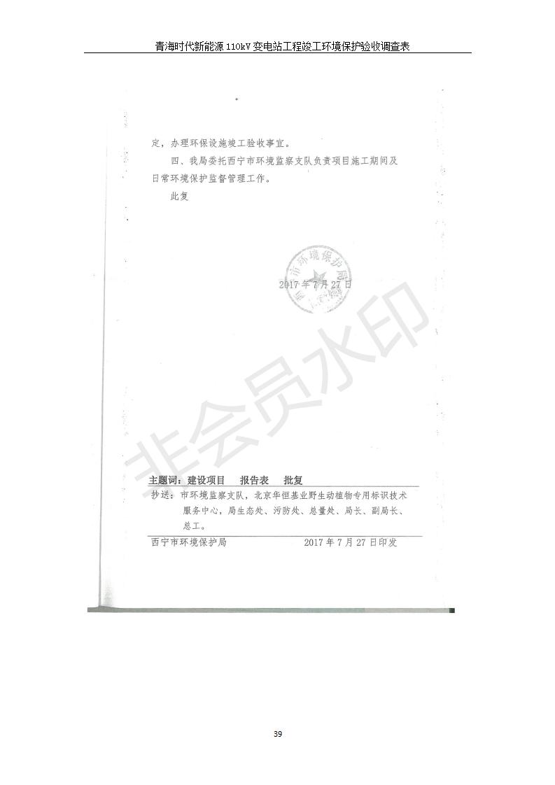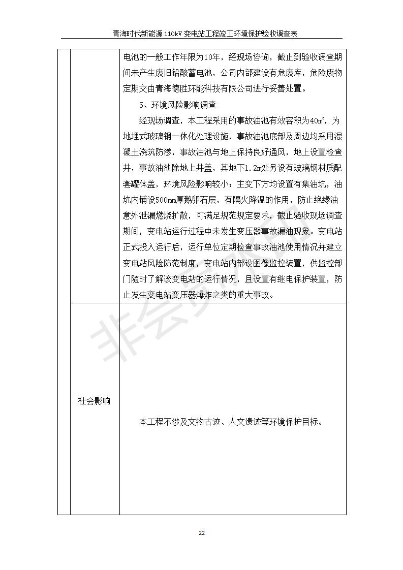根據(jù)中華人民共和國國務(wù)院令第682號《國務(wù)院關(guān)于修改〈建設(shè)項目環(huán)境保護管理條例〉的決定》和《建設(shè)項目竣工環(huán)境保護驗收暫行辦法》(國務(wù)院令682號),青海時代新能源110kV變電站工程(包括竣工環(huán)境保護驗收調(diào)查表和驗收意見)公示如下。 一、項目名稱:青海時代新能源110kV變電站工程 二、地點:青海省西寧市南川工業(yè)園區(qū)創(chuàng)業(yè)路182號青海時代新能源科技有限公司廠區(qū)內(nèi) 三、建設(shè)單位:青海時代新能源科技有限公司 四、建設(shè)內(nèi)容:青海時代新能源 110kV 變電站采用全戶內(nèi)布置方式,依據(jù)環(huán)評報告及批復(fù)文件,經(jīng)現(xiàn)場踏勘本工程建設(shè)只包含變電站建設(shè)部分,輸電線路由南川工業(yè)園區(qū)管委會負(fù)責(zé)建設(shè),輸電線路不屬于本次驗收調(diào)查范圍。工程本期規(guī)模2×31.5MVA,電壓等級為110/10kV。變電站 110kV 出線間隔最終2回,本期建設(shè)出線間隔2回;10kV最終電纜出線8回,本期電纜出線6回。 五、聯(lián)系人:張工 六、聯(lián)系電話:0971-6515411 七、公示時間:二〇二〇年一月十四日至二〇二〇年二月十三日 公示期間,對上述公示內(nèi)容如有異議,請以書面形式反饋,個人須署真實姓名,單位須加蓋公章。