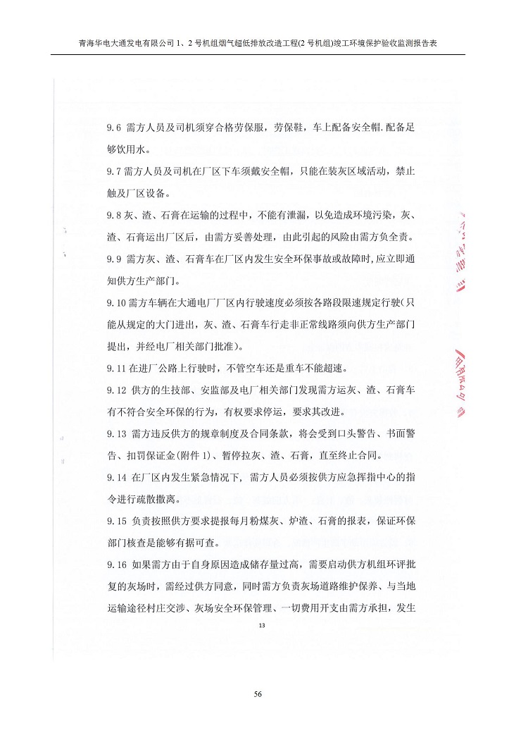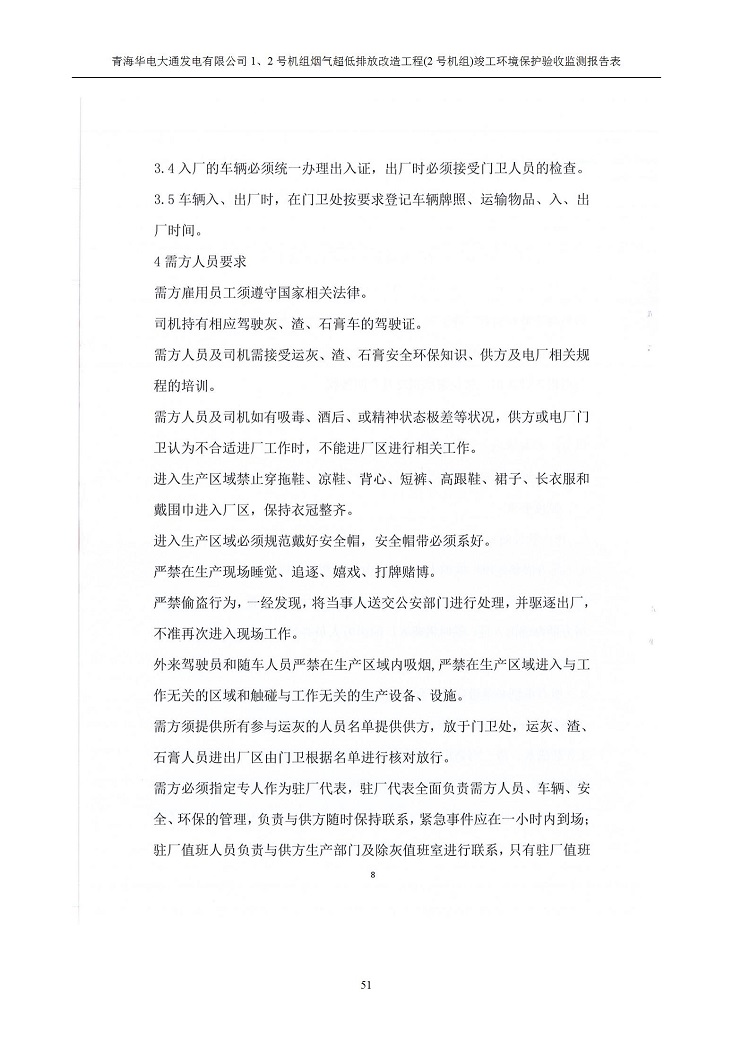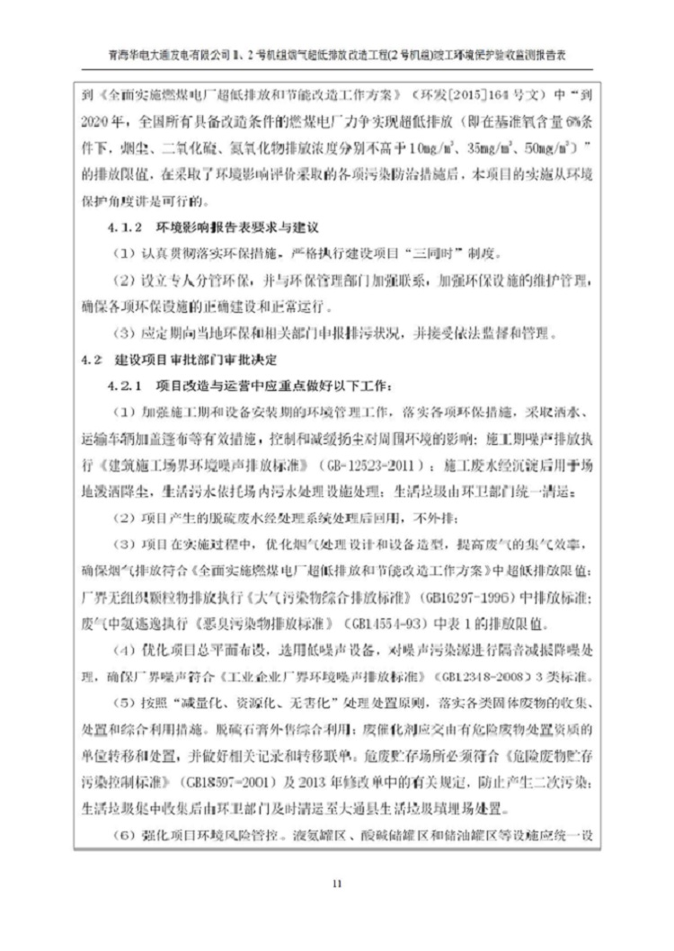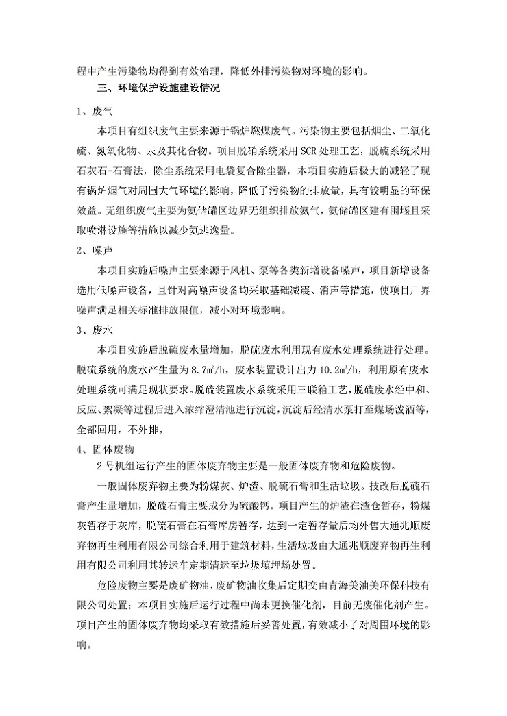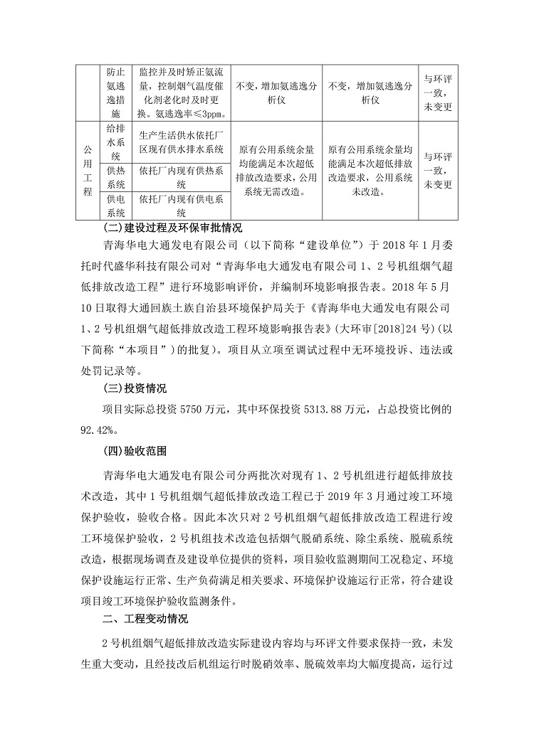 根據(jù)中華人民共和國國務(wù)院令第682號《國務(wù)院關(guān)于修改〈建設(shè)項目環(huán)境保護(hù)管理條例〉的決定》和《建設(shè)項目竣工環(huán)境保護(hù)驗收暫行辦法》(國務(wù)院令682號),青海華電大通發(fā)電有限公司1、2號機(jī)組煙氣超低排放改造工程(2號機(jī)組) (包括竣工環(huán)境保護(hù)驗收監(jiān)測報告表和驗收意見)公示如下。 一、項目名稱:青海華電大通發(fā)電有限公司1、2號機(jī)組煙氣超低排放改造工程(2號機(jī)組) 竣工環(huán)境保護(hù)驗收監(jiān)測報告表 二、地點(diǎn):青海省西寧市大通縣寧張公路31公里處 三、建設(shè)單位:青海華電大通發(fā)電有限公司 四、建設(shè)內(nèi)容:2號機(jī)組煙氣超低排放改造,2號機(jī)組改造內(nèi)容為脫硫系統(tǒng)保留原脫硫裝置作為一級塔,新建二級合金托盤塔串聯(lián)吸收塔;對原“1+2”電袋復(fù)合除塵器的一電場電源進(jìn)行改造,對布袋除塵器濾袋進(jìn)行更換;對原脫硝系統(tǒng)選擇性催化還原法(SCR)脫硝工藝加裝備用催化劑,每層催化劑增加聲波吹灰器,優(yōu)化SCR反應(yīng)器入口導(dǎo)流板。 五、聯(lián)系人:馬世敏 六、聯(lián)系電 話:0971-6515411 七、公示時間:二〇二〇年四月二十九日至二〇二〇年五月二十八日 公示期間,對上述公示內(nèi)容如有異議,請以書面形式反饋,個人須署真實姓名,單位須加蓋公章。